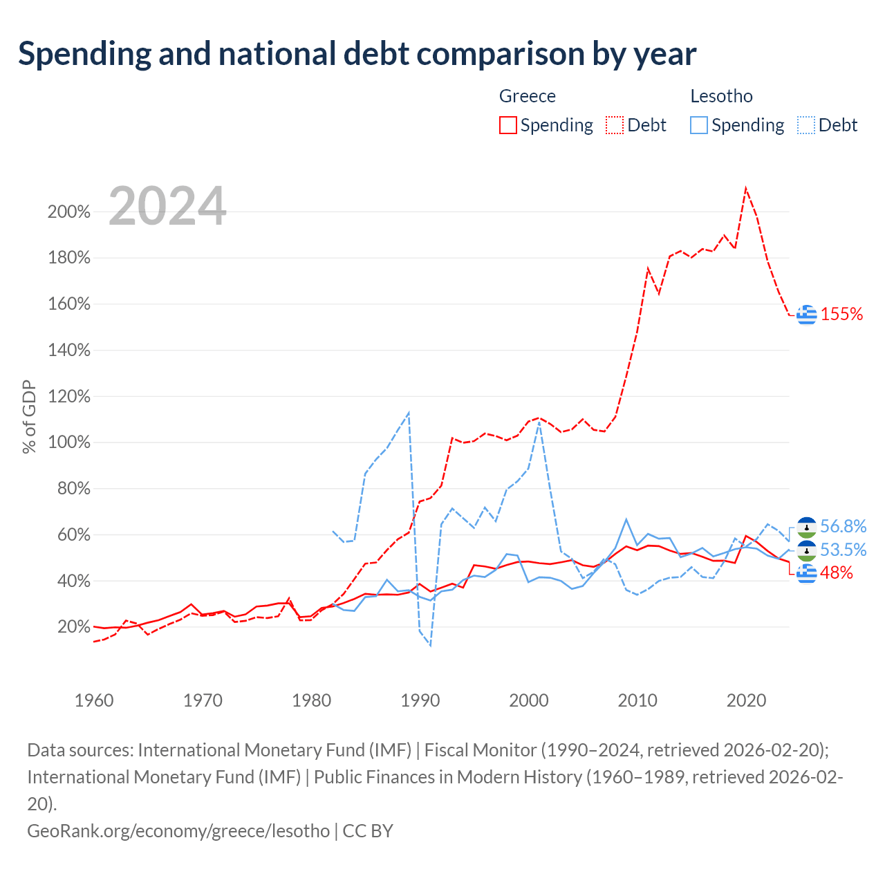 Greece has $397B in government debt (154.8% of GDP), compared to $1.29B (56.8% of GDP) in Lesotho.