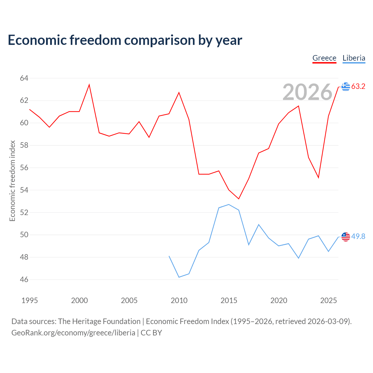 The Economic Freedom Index for Greece is 63.2, ranking 82/197, compared to 49.8 for Liberia, ranking 163/197. The chart above displays a comparison of annual changes in economic freedom indexes.