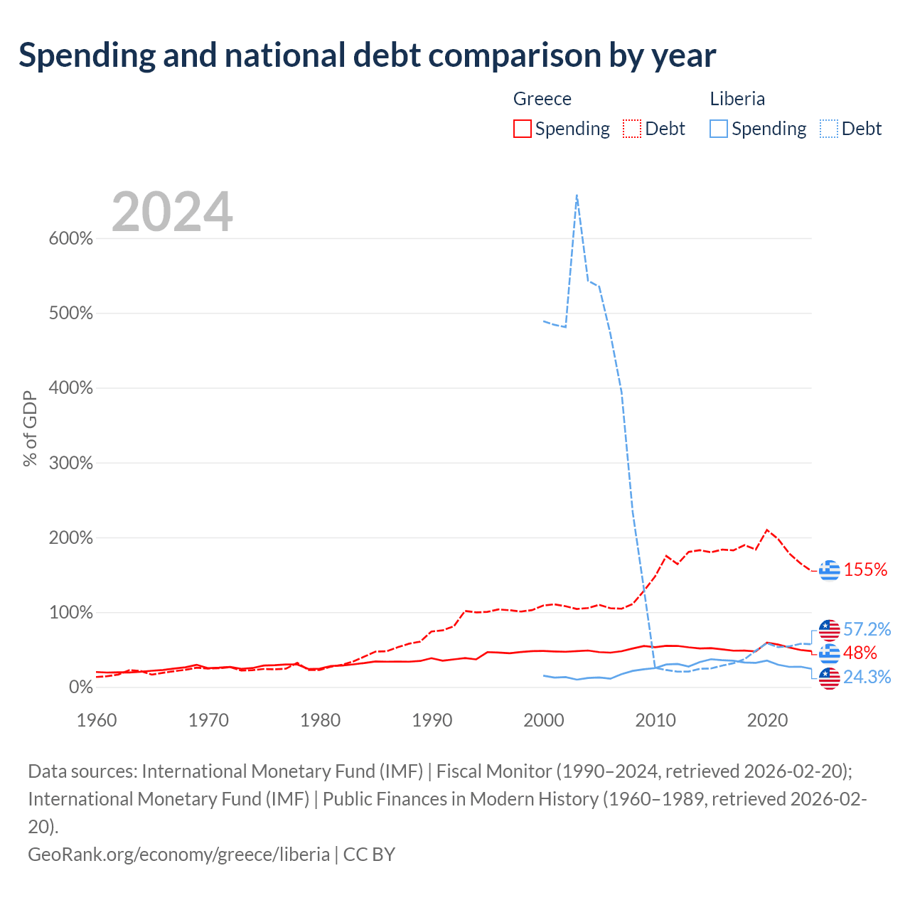 Greece has $397B in government debt (154.8% of GDP), compared to $2.73B (57.2% of GDP) in Liberia.