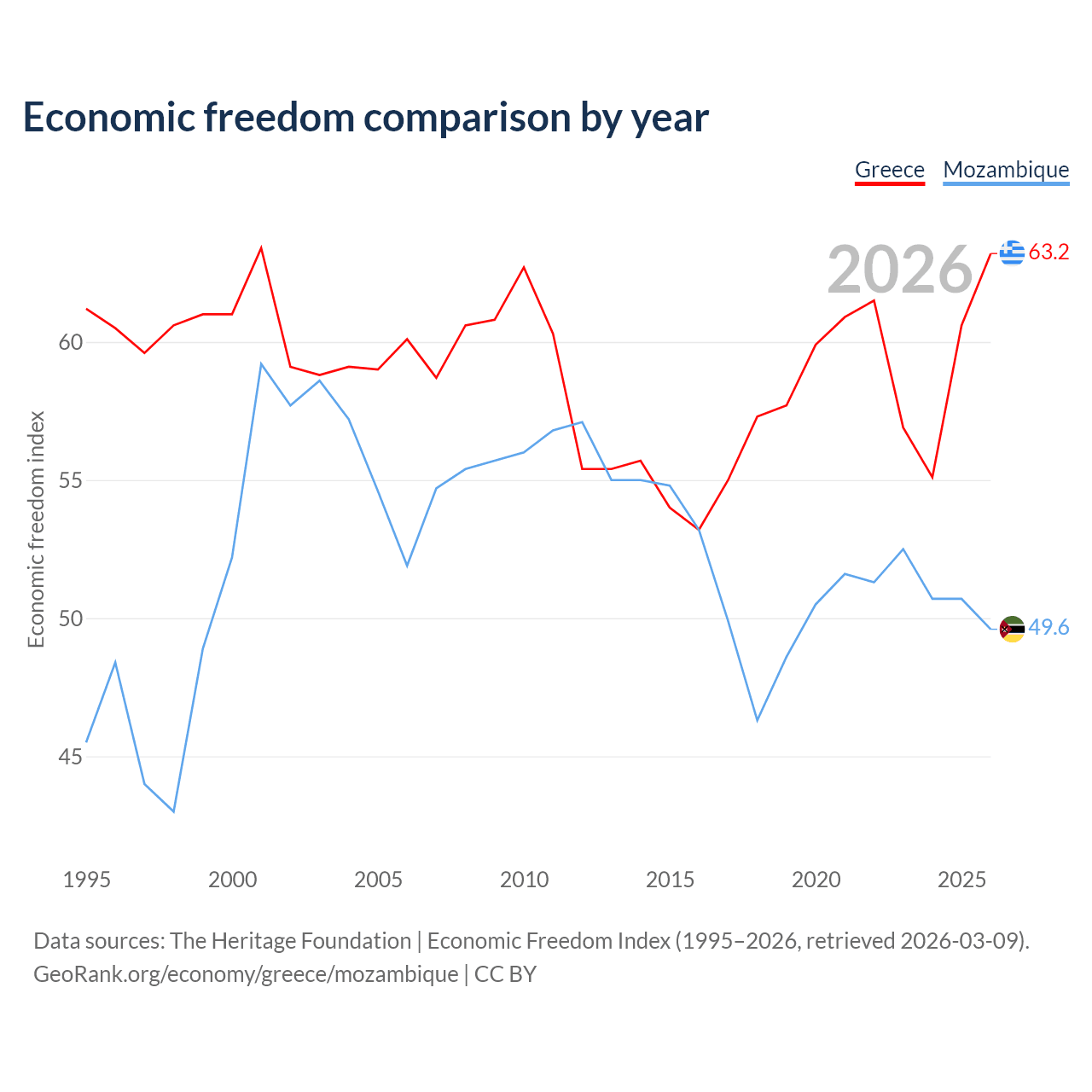 The Economic Freedom Index for Greece is 63.2, ranking 82/197, compared to 49.6 for Mozambique, ranking 164/197. The chart above displays a comparison of annual changes in economic freedom indexes.