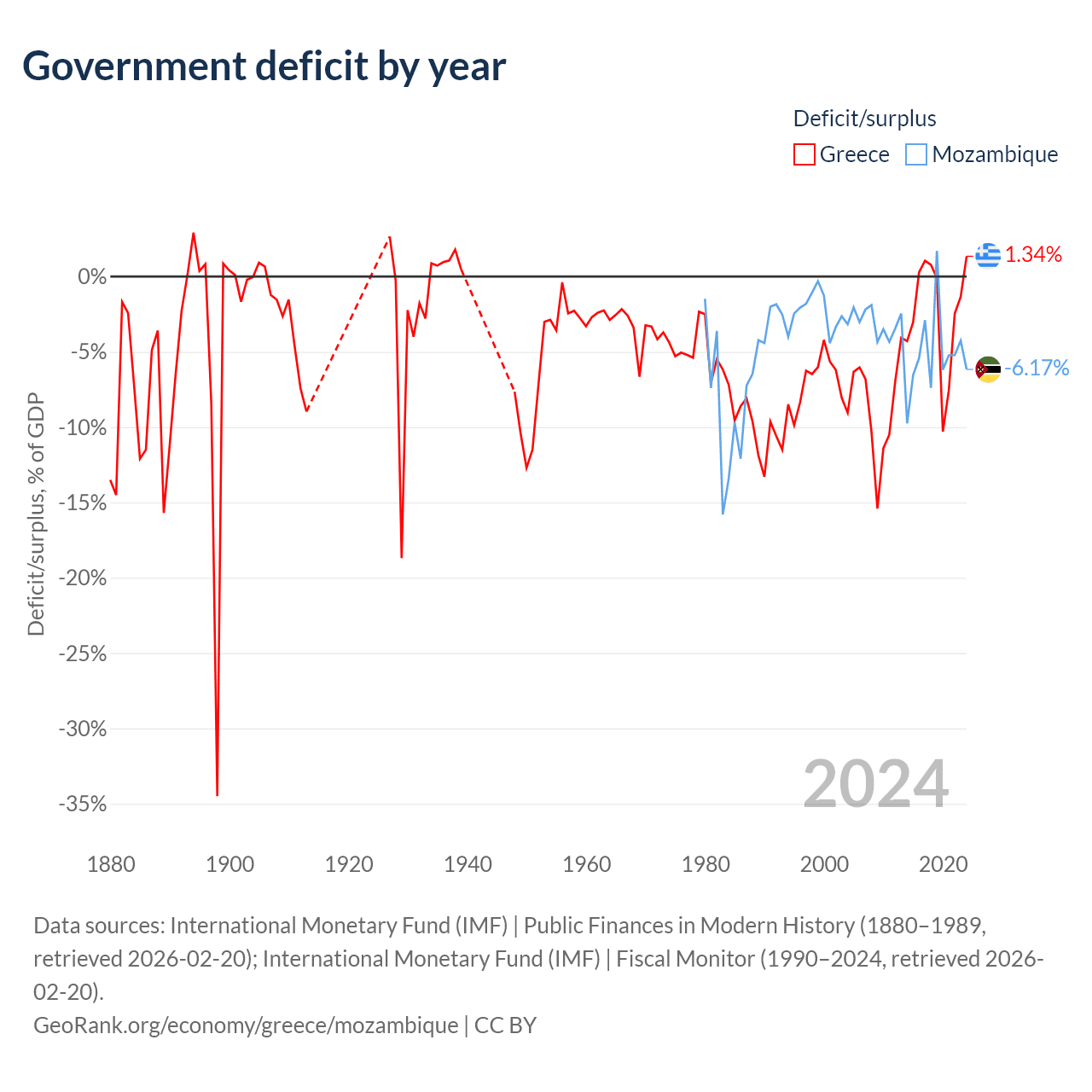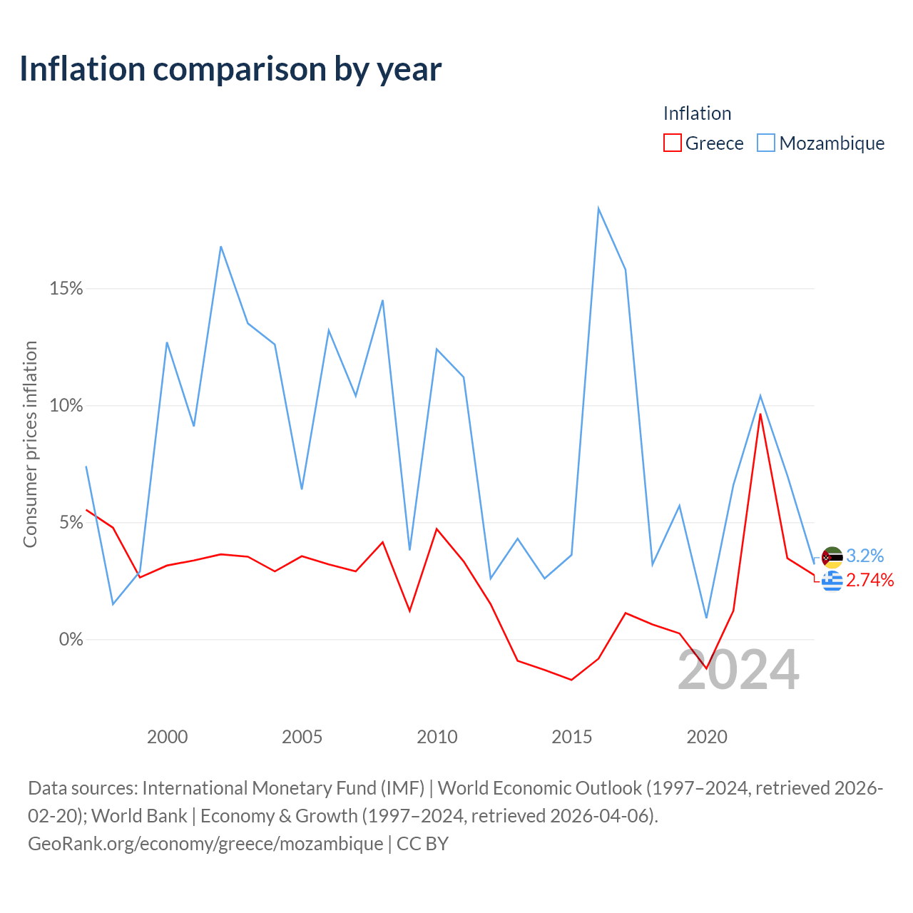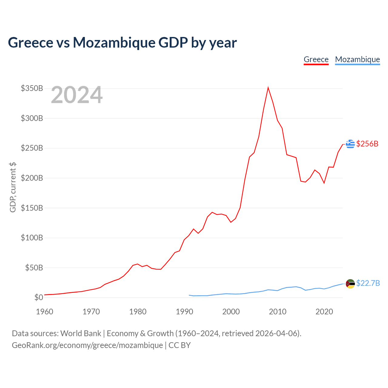 Greece has a GDP of $256B compared to $22.7B for Mozambique, ranking 53/197 and 123/197 by economy size, respectively.