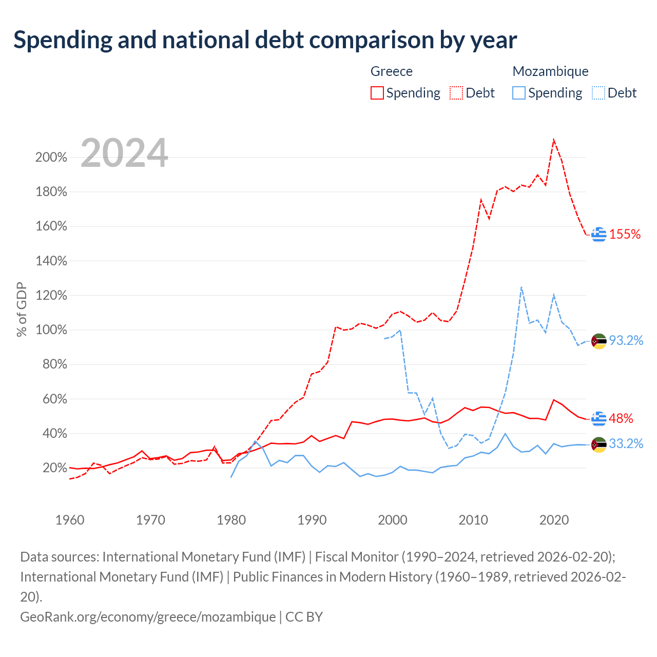 Greece has $397B in government debt (154.8% of GDP), compared to $21.2B (93.2% of GDP) in Mozambique.