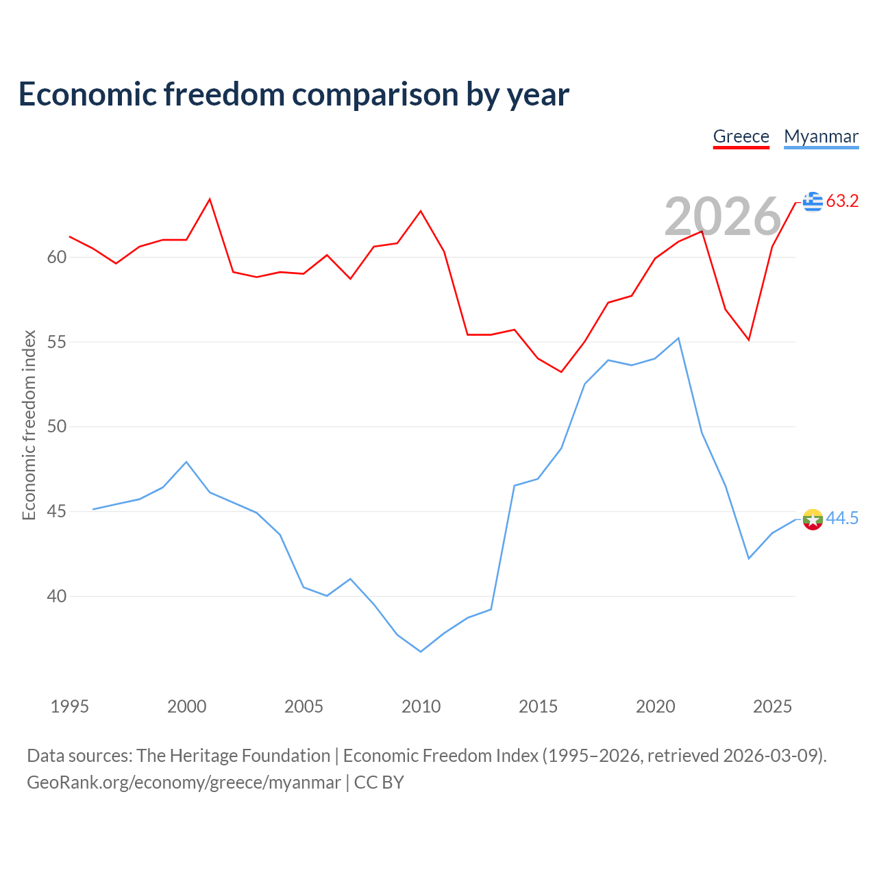 The Economic Freedom Index for Greece is 63.2, ranking 82/197, compared to 44.5 for Myanmar, ranking 180/197. The chart above displays a comparison of annual changes in economic freedom indexes.