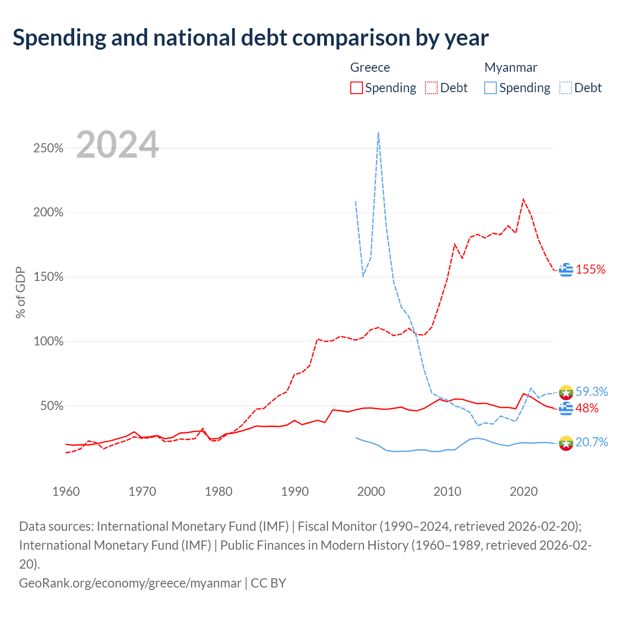 Greece has $397B in government debt (154.8% of GDP), compared to $44B (59.3% of GDP) in Myanmar.