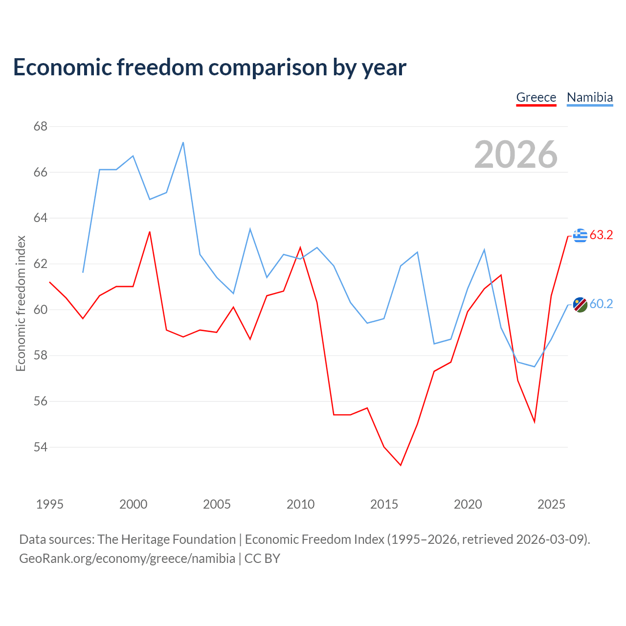 The Economic Freedom Index for Greece is 63.2, ranking 82/197, compared to 60.2 for Namibia, ranking 95/197. The chart above displays a comparison of annual changes in economic freedom indexes.