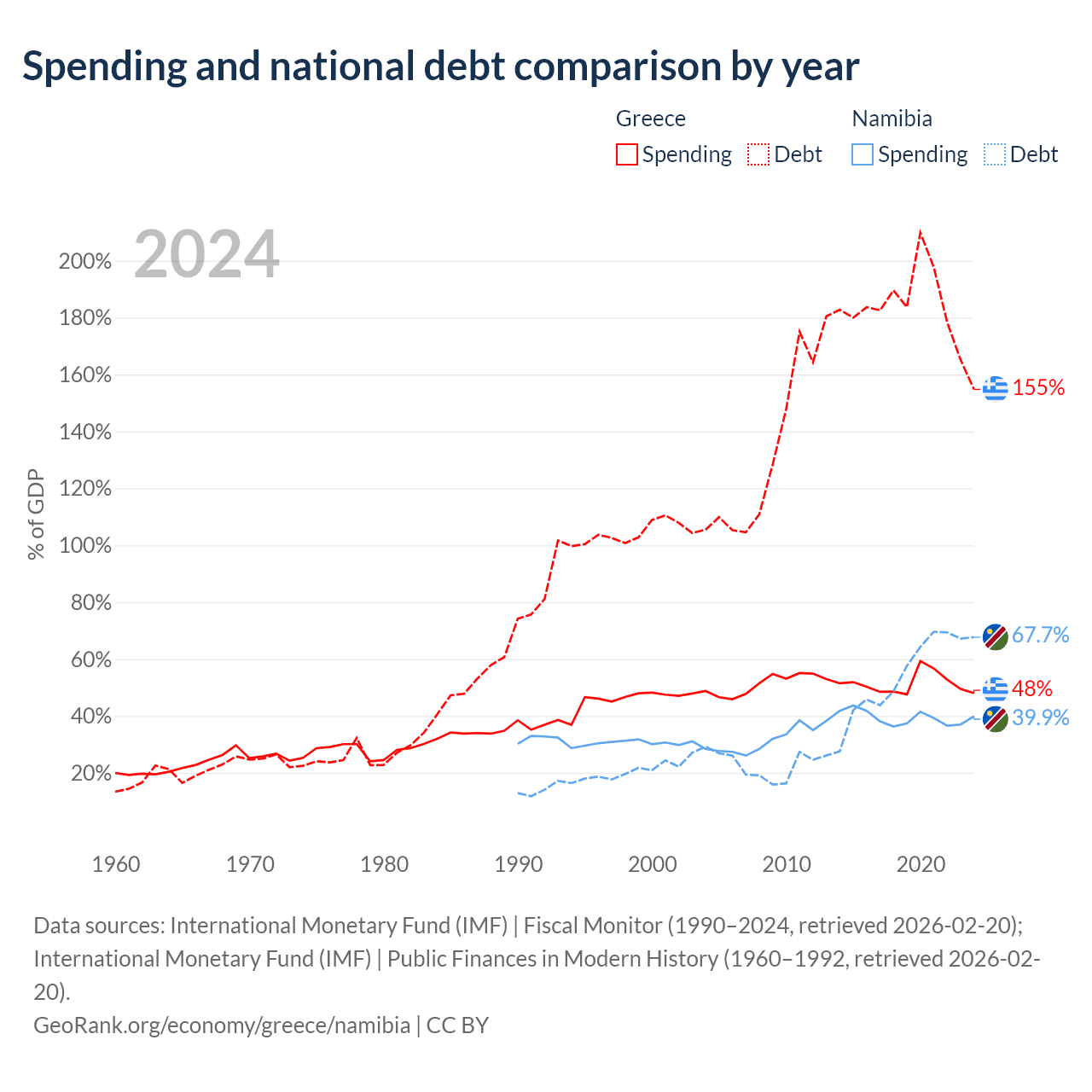 Greece has $397B in government debt (154.8% of GDP), compared to $9.05B (67.7% of GDP) in Namibia.