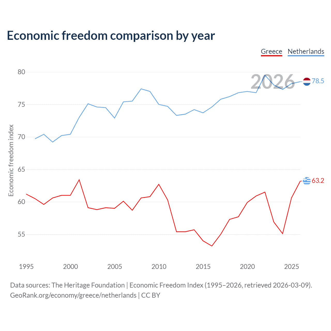 The Economic Freedom Index for Greece is 63.2, ranking 82/197, compared to 78.5 for the Netherlands, ranking 11/197. The chart above displays a comparison of annual changes in economic freedom indexes.