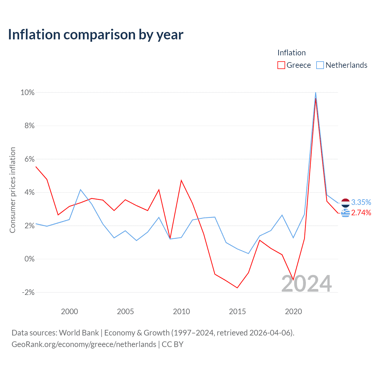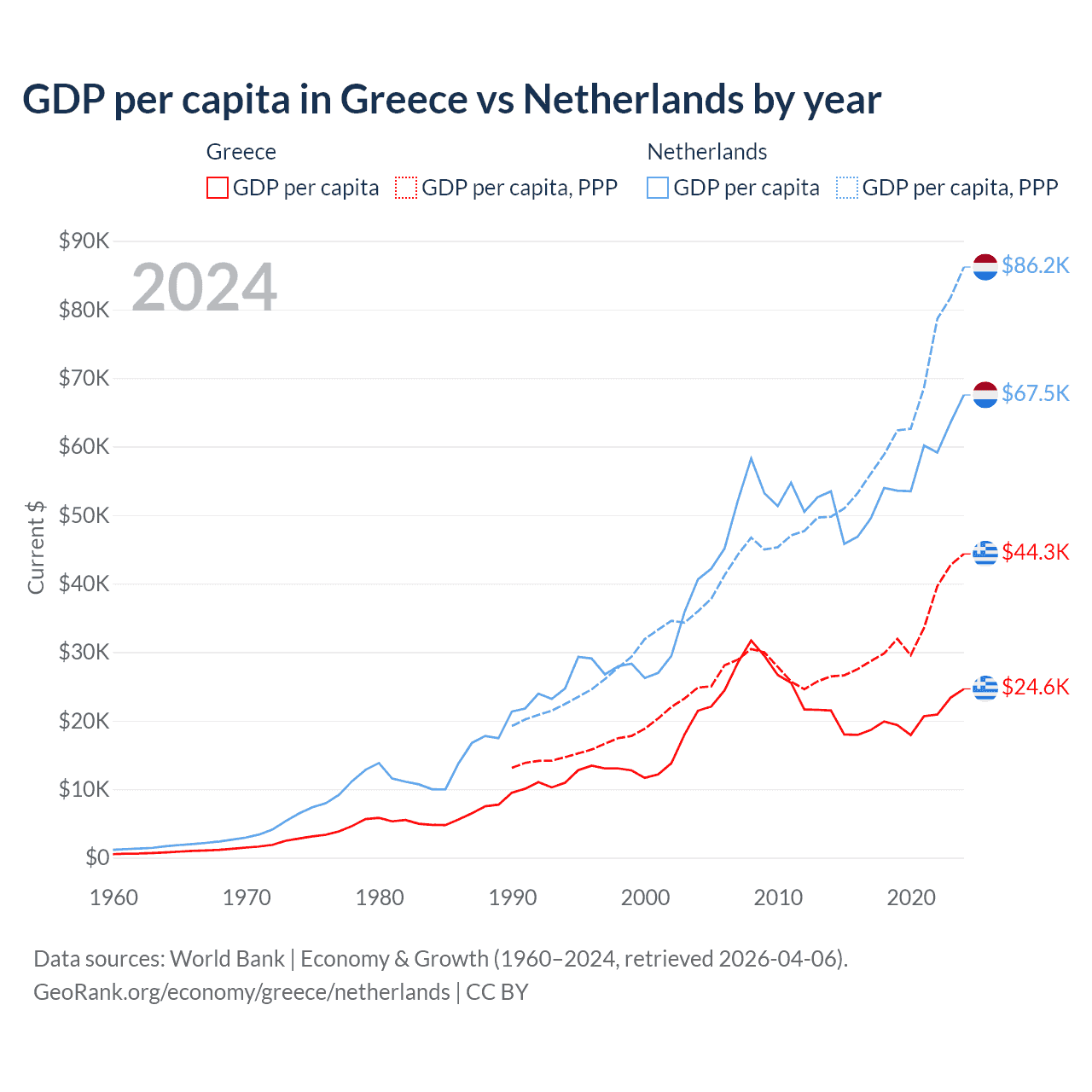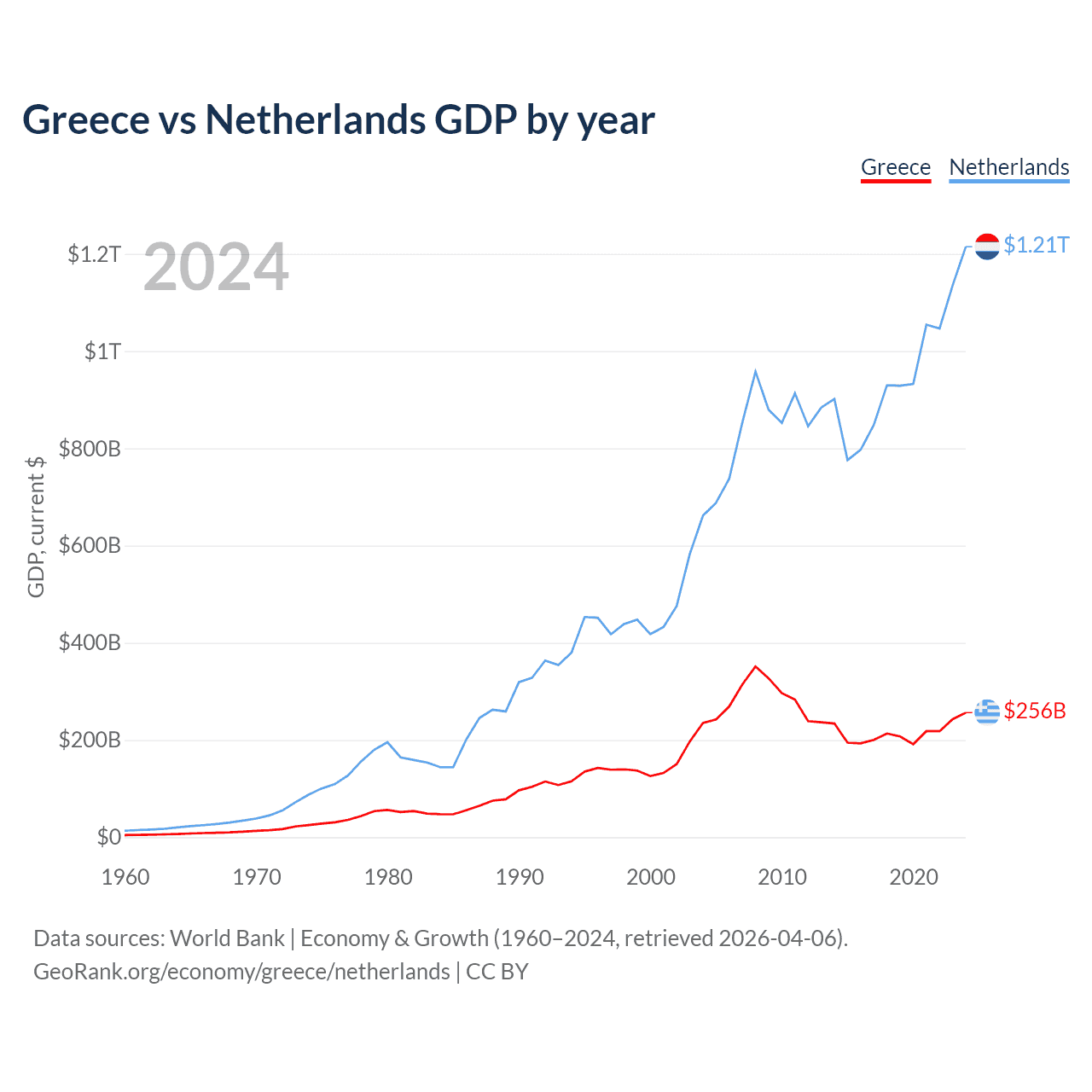 Greece has a GDP of $256B compared to $1.21T for the Netherlands, ranking 53/197 and 19/197 by economy size, respectively.