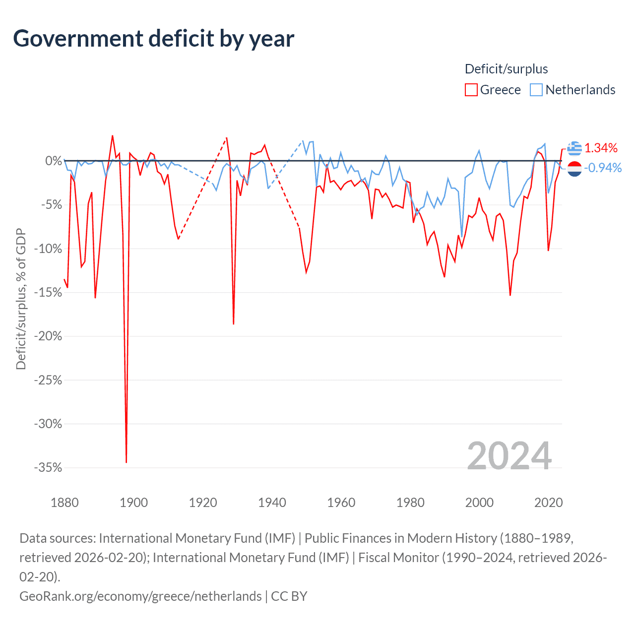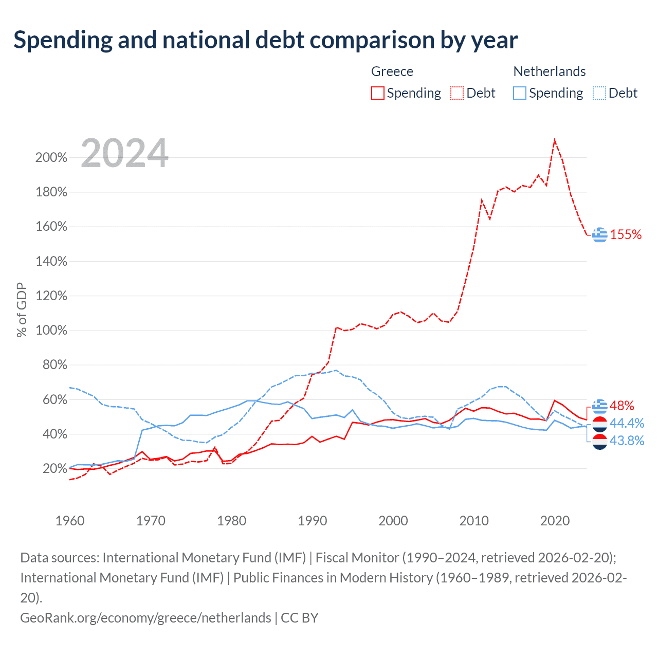 Greece has $397B in government debt (154.8% of GDP), compared to $532B (43.8% of GDP) in the Netherlands.