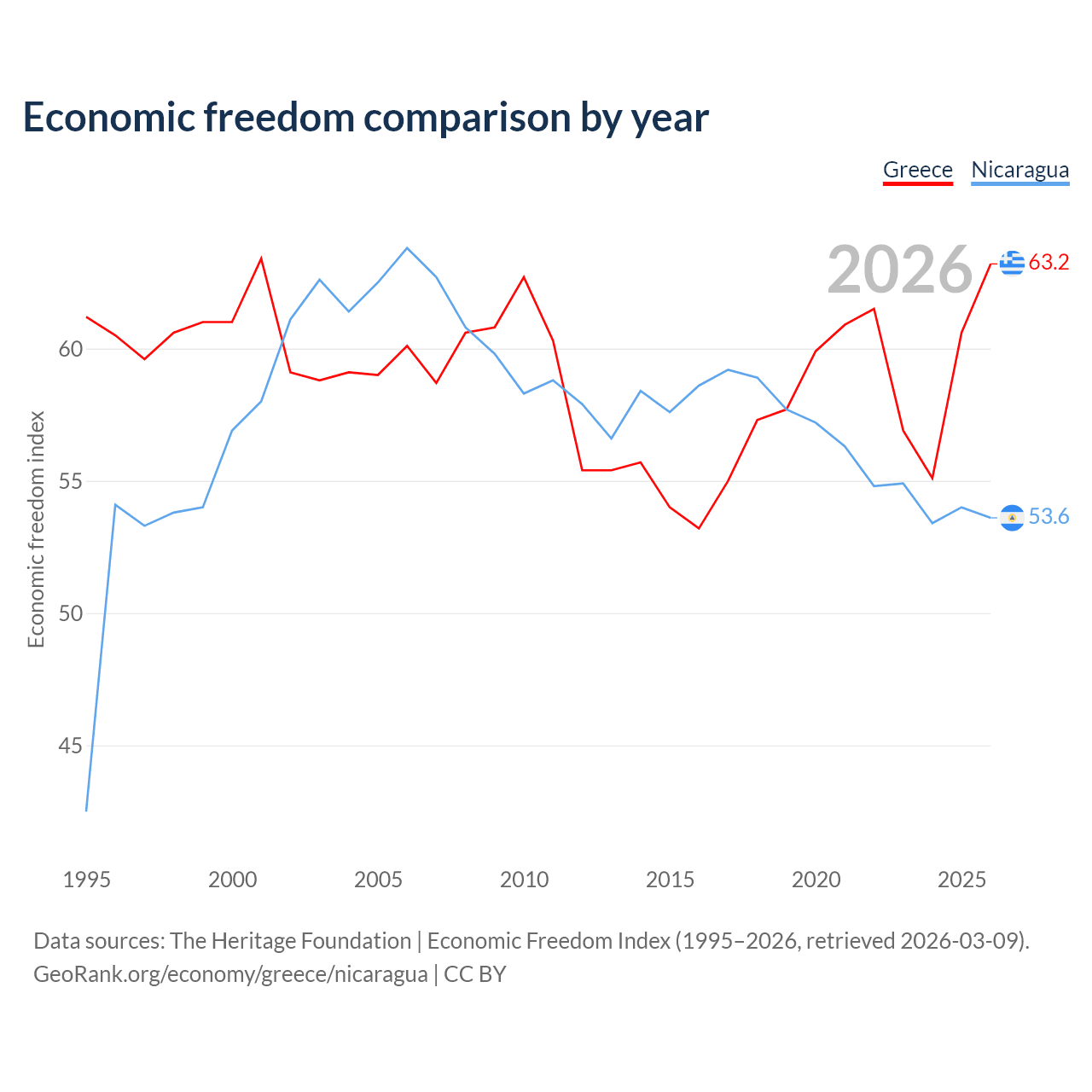 The Economic Freedom Index for Greece is 63.2, ranking 82/197, compared to 53.6 for Nicaragua, ranking 139/197. The chart above displays a comparison of annual changes in economic freedom indexes.