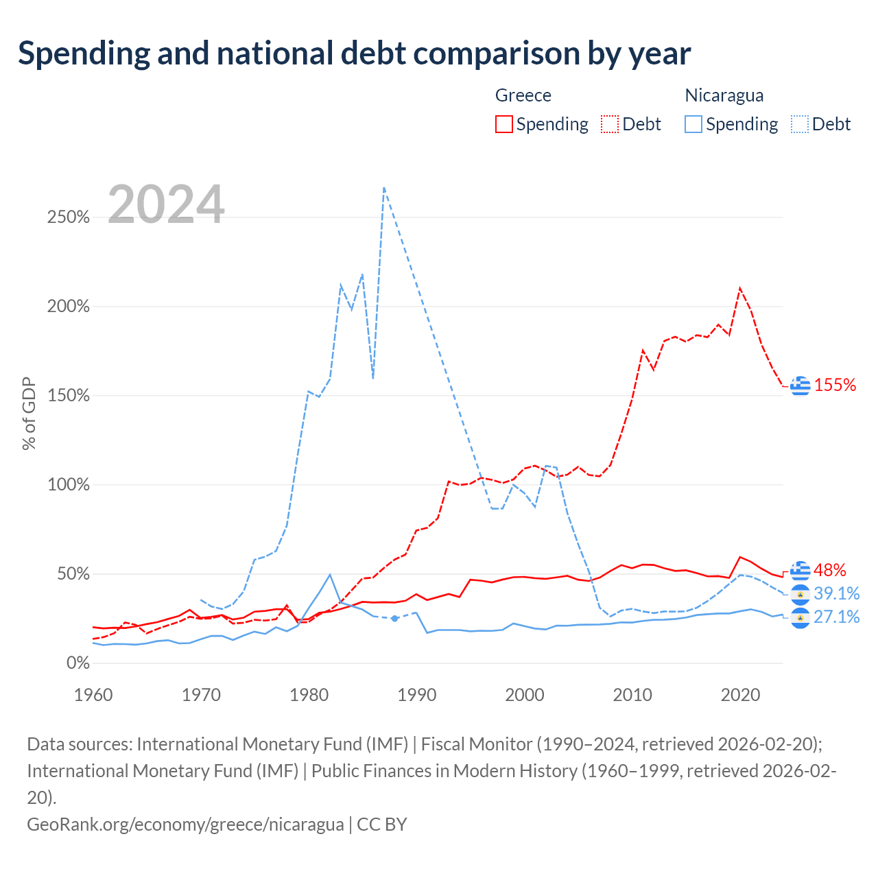 Greece has $397B in government debt (154.8% of GDP), compared to $7.71B (39.1% of GDP) in Nicaragua.