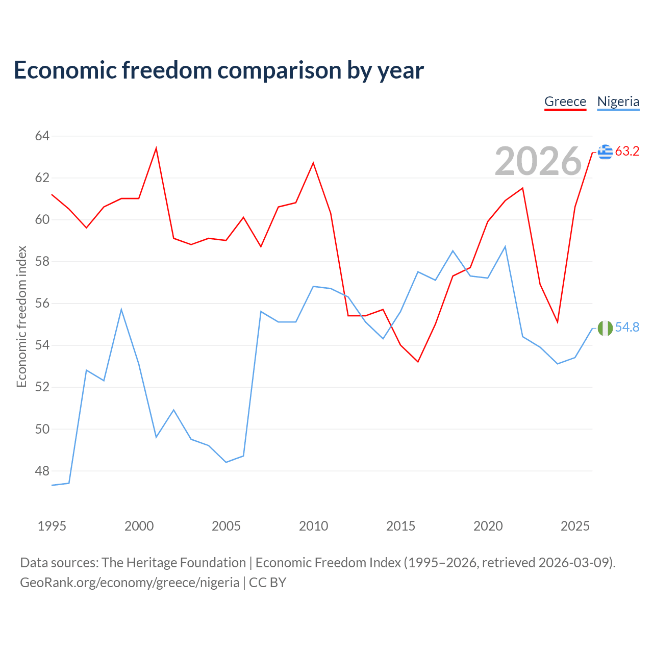 The Economic Freedom Index for Greece is 63.2, ranking 82/197, compared to 54.8 for Nigeria, ranking 132/197. The chart above displays a comparison of annual changes in economic freedom indexes.