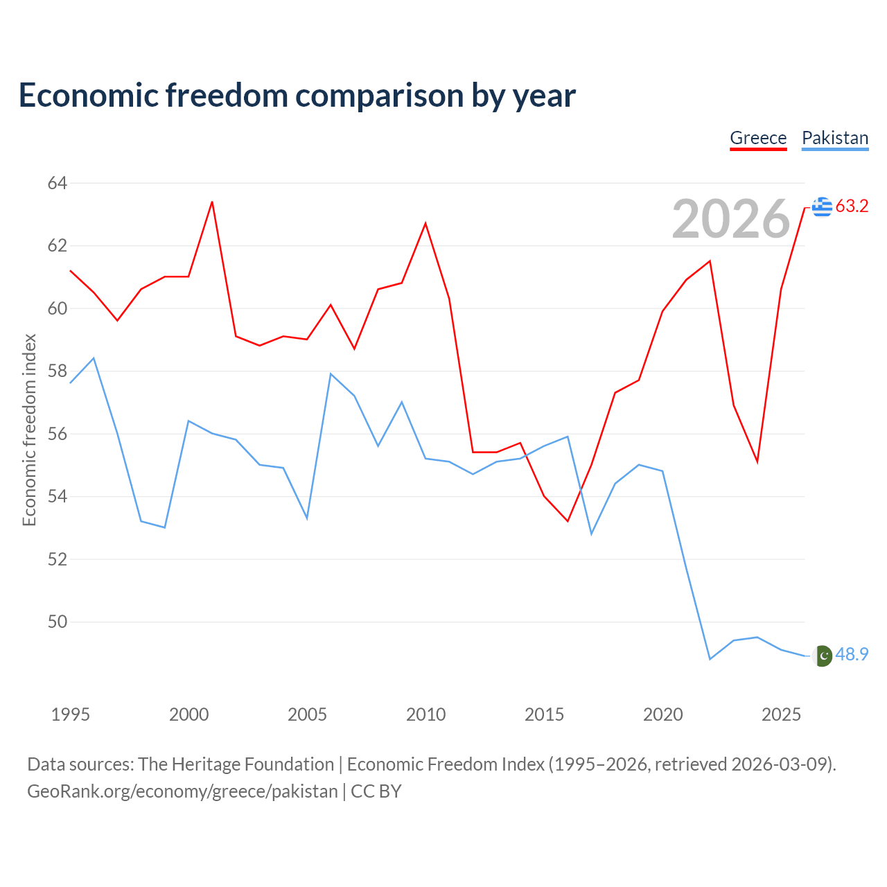 The Economic Freedom Index for Greece is 63.2, ranking 82/197, compared to 48.9 for Pakistan, ranking 168/197. The chart above displays a comparison of annual changes in economic freedom indexes.