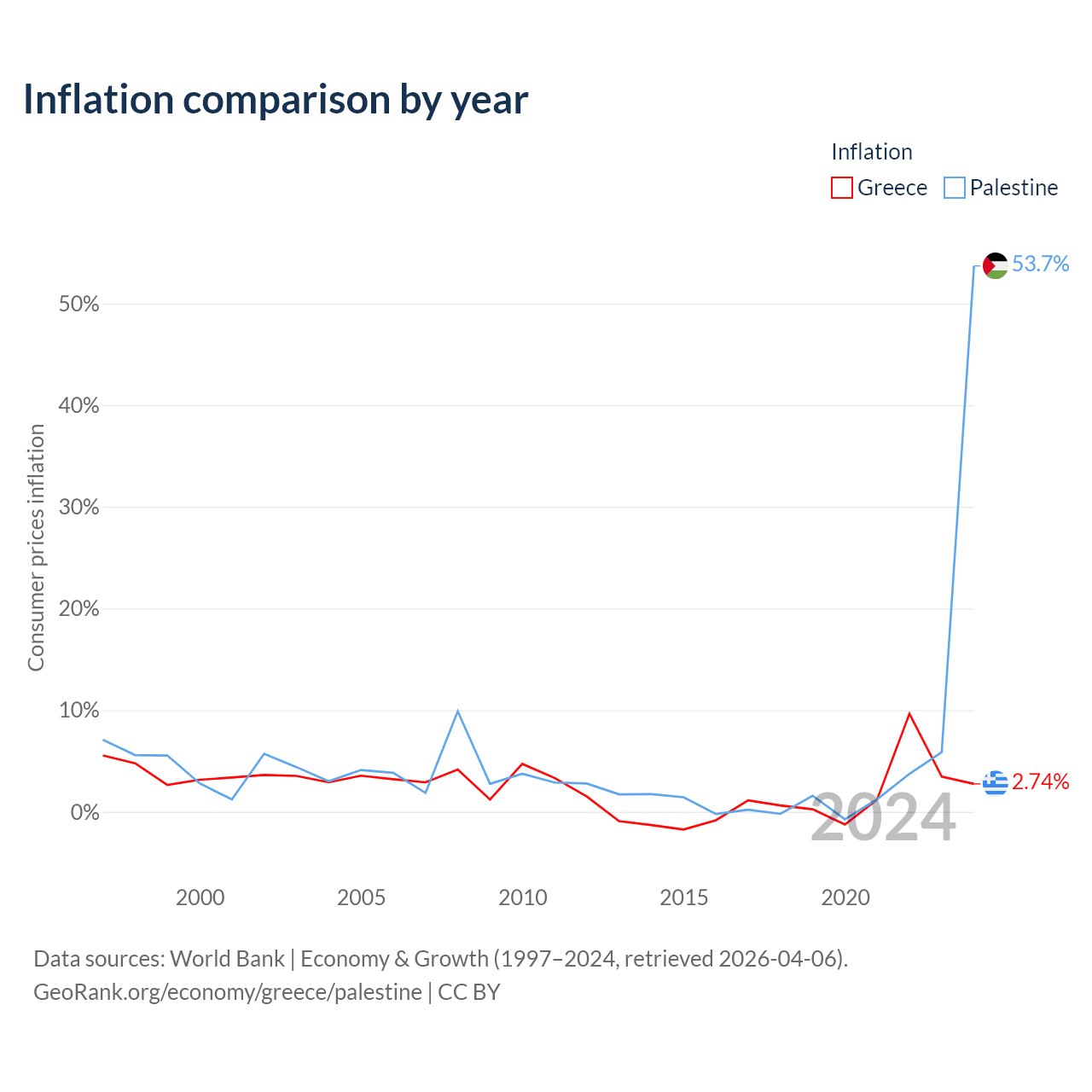 Greece has a GDP of $256B compared to $13.7B for Palestine, ranking 53/197 and 146/197 by economy size, respectively.