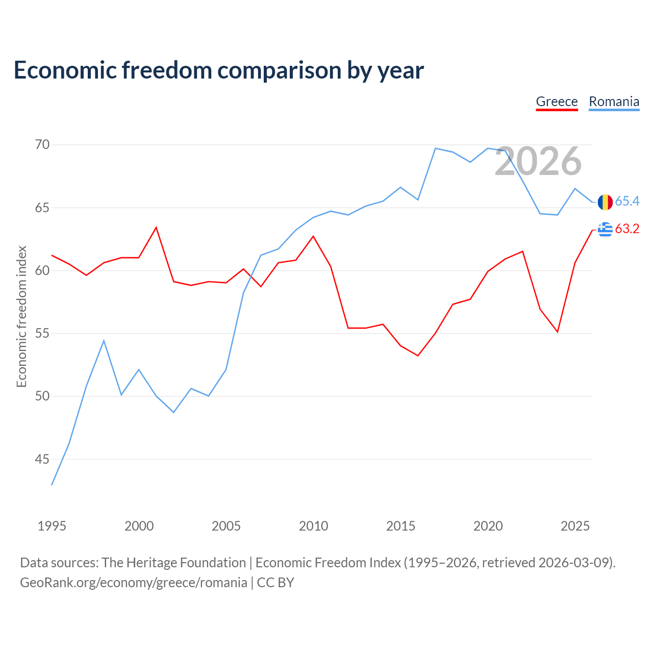 The Economic Freedom Index for Greece is 63.2, ranking 82/197, compared to 65.4 for Romania, ranking 64/197. The chart above displays a comparison of annual changes in economic freedom indexes.
