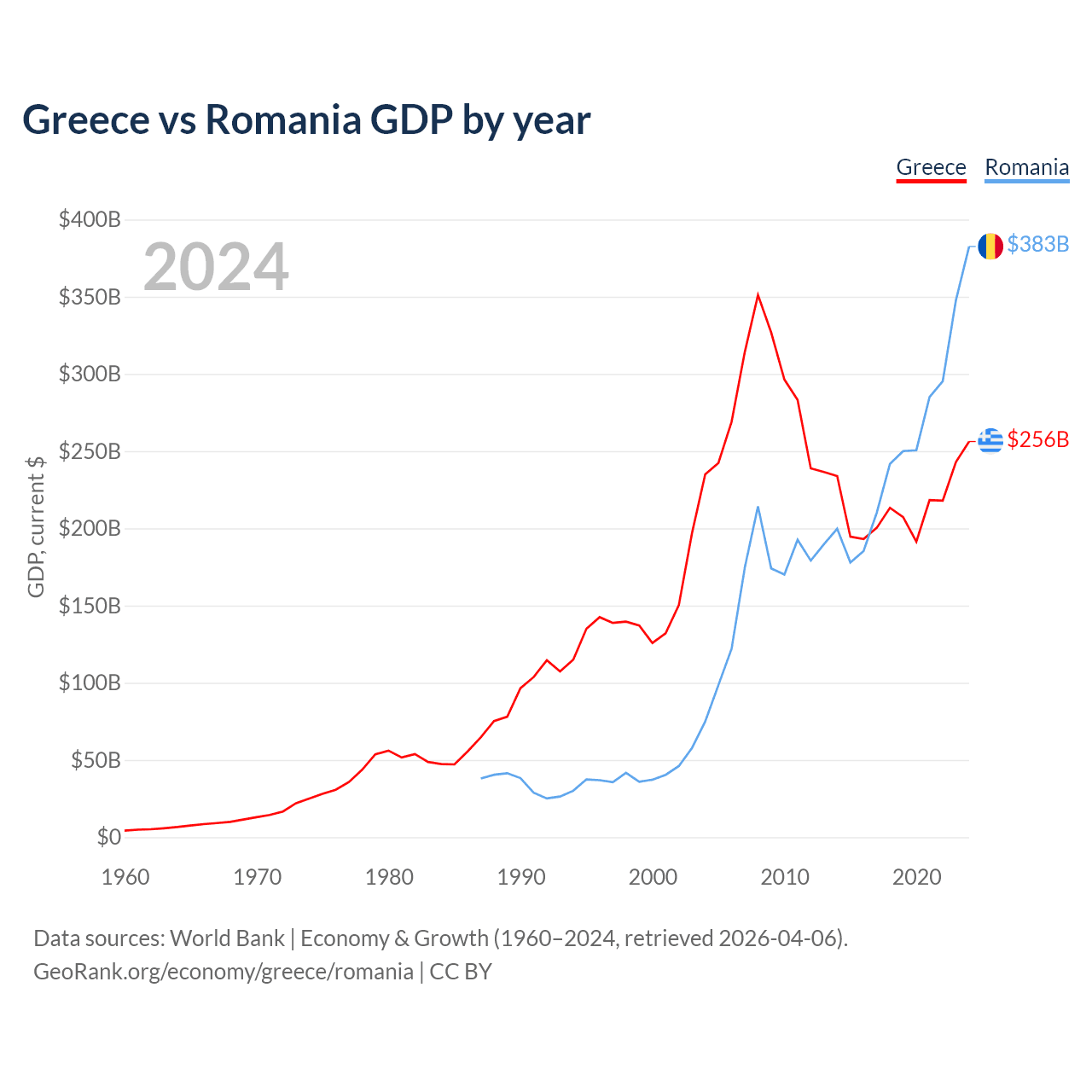 Greece vs Romania GDP by year