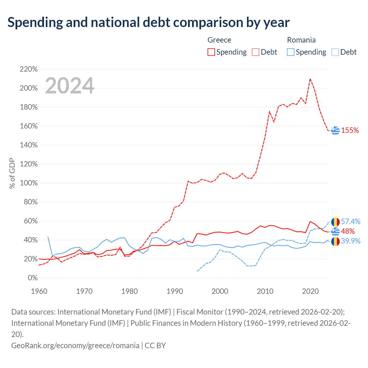 Greece has $397B in government debt (154.8% of GDP), compared to $220B (57.4% of GDP) in Romania.