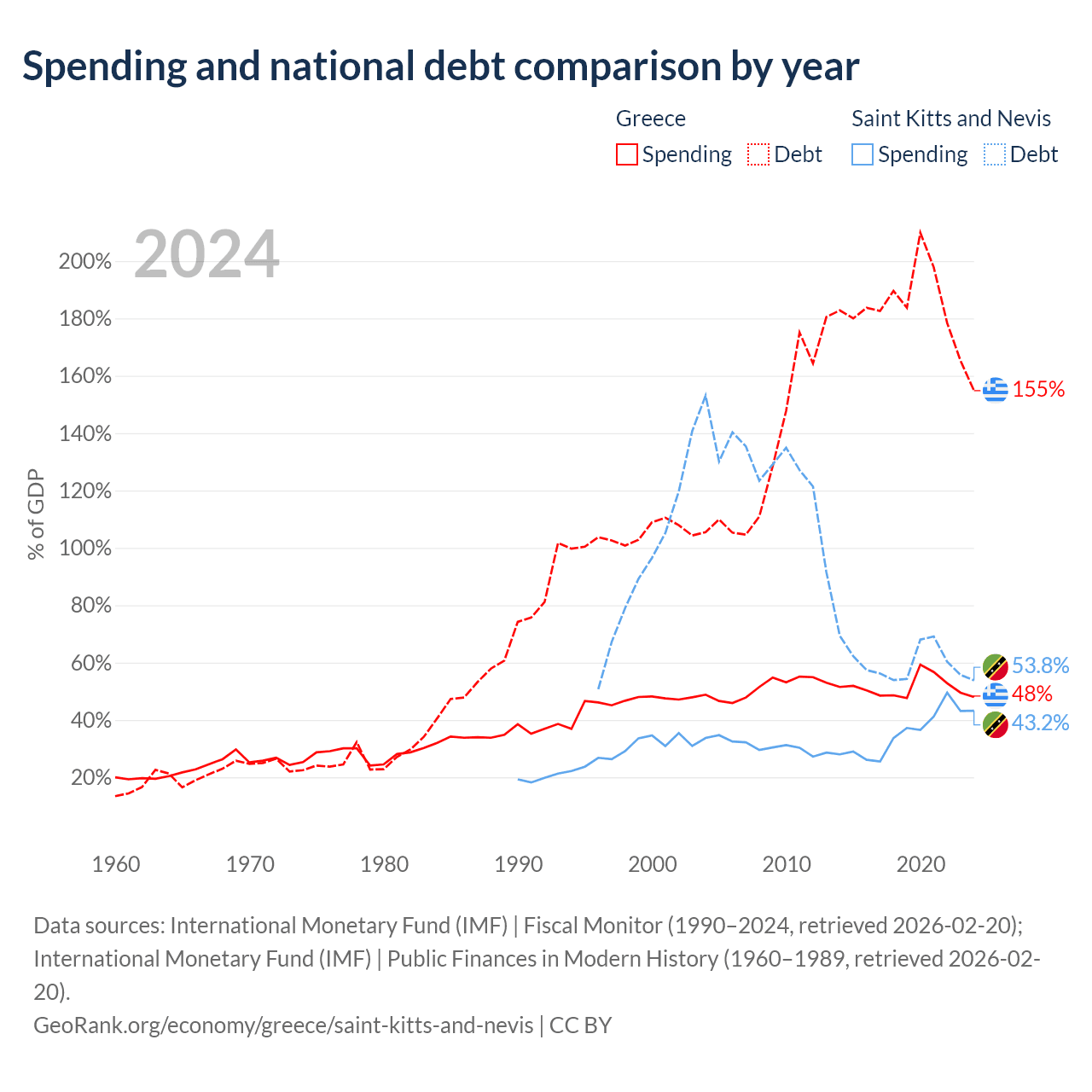 Greece has $397B in government debt (154.8% of GDP), compared to $604M (53.8% of GDP) in Saint Kitts and Nevis.
