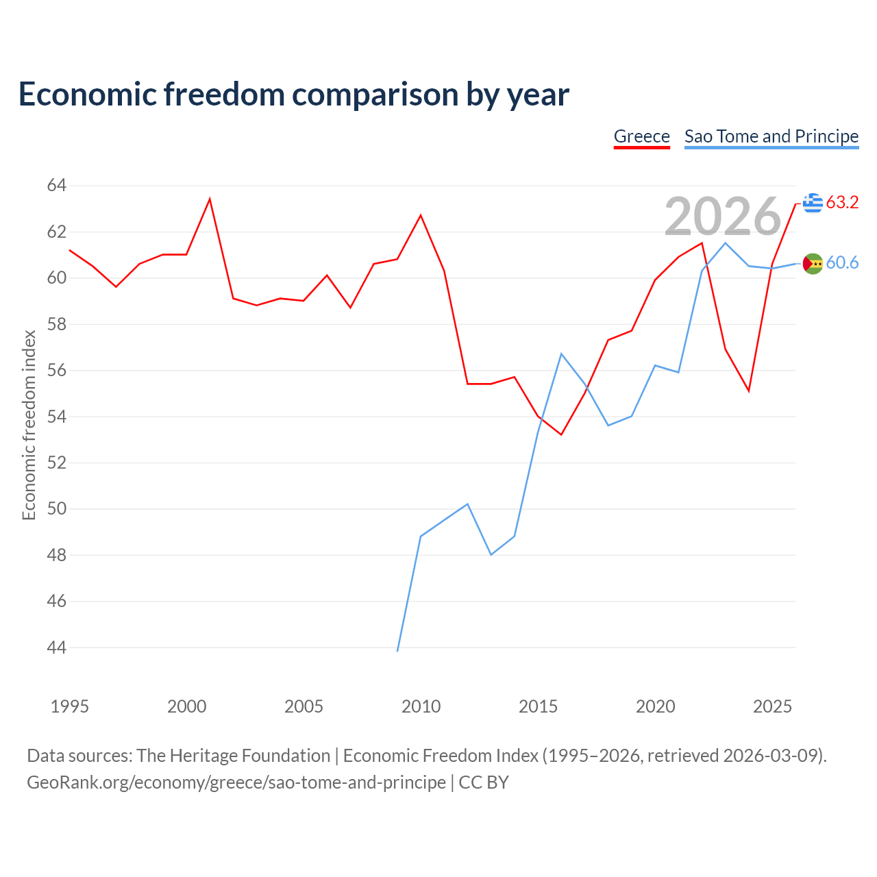 The Economic Freedom Index for Greece is 63.2, ranking 82/197, compared to 60.6 for Sao Tome and Principe, ranking 93/197. The chart above displays a comparison of annual changes in economic freedom indexes.