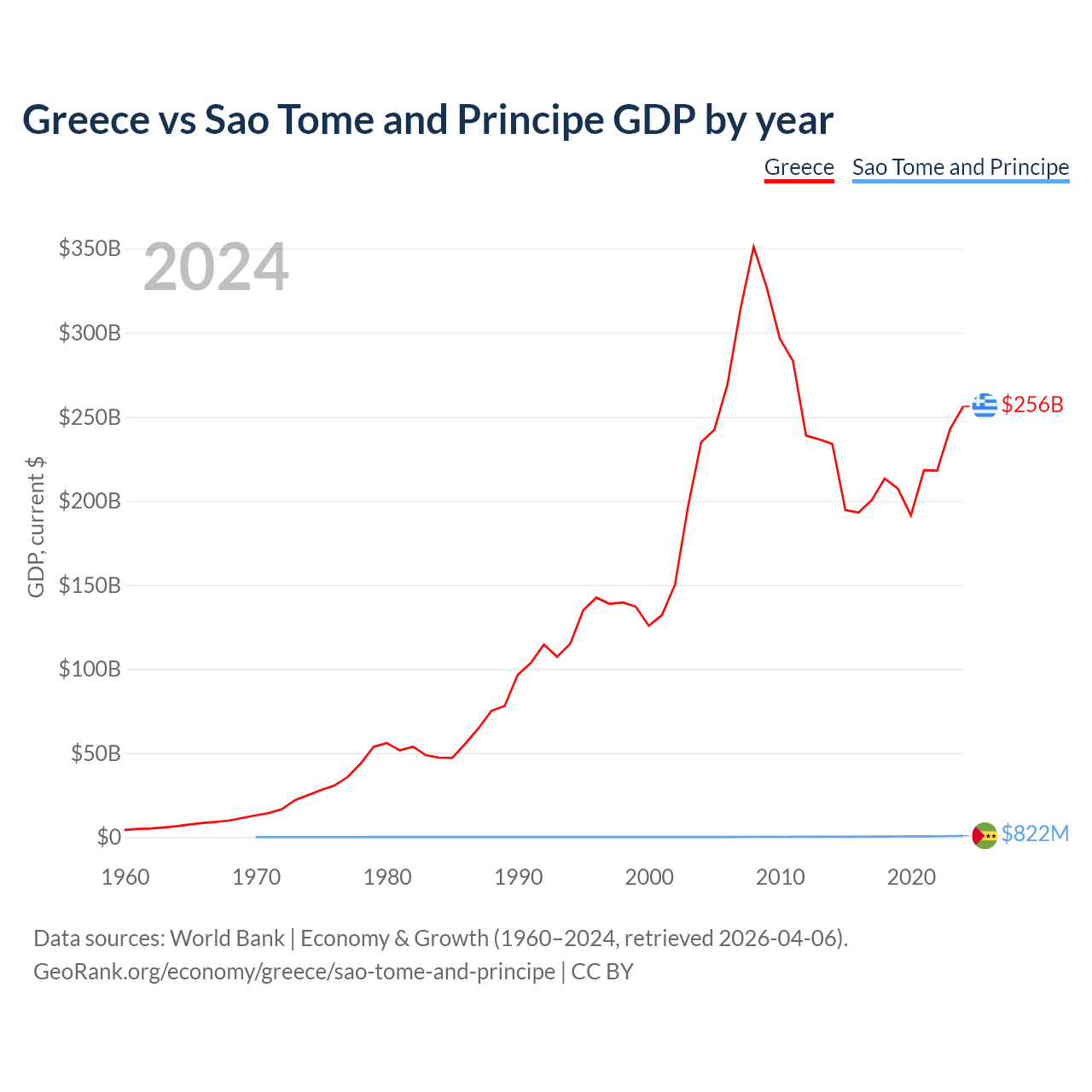 Greece has a GDP of $256B compared to $822M for Sao Tome and Principe, ranking 53/197 and 189/197 by economy size, respectively.