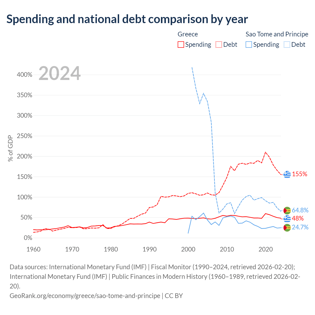 Greece has $397B in government debt (154.8% of GDP), compared to $533M (64.8% of GDP) in Sao Tome and Principe.