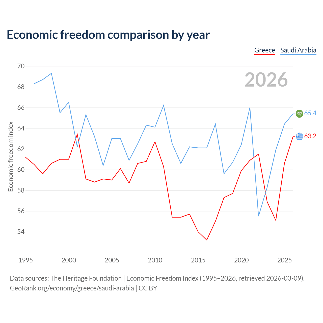 The Economic Freedom Index for Greece is 63.2, ranking 82/197, compared to 65.4 for Saudi Arabia, ranking 65/197. The chart above displays a comparison of annual changes in economic freedom indexes.
