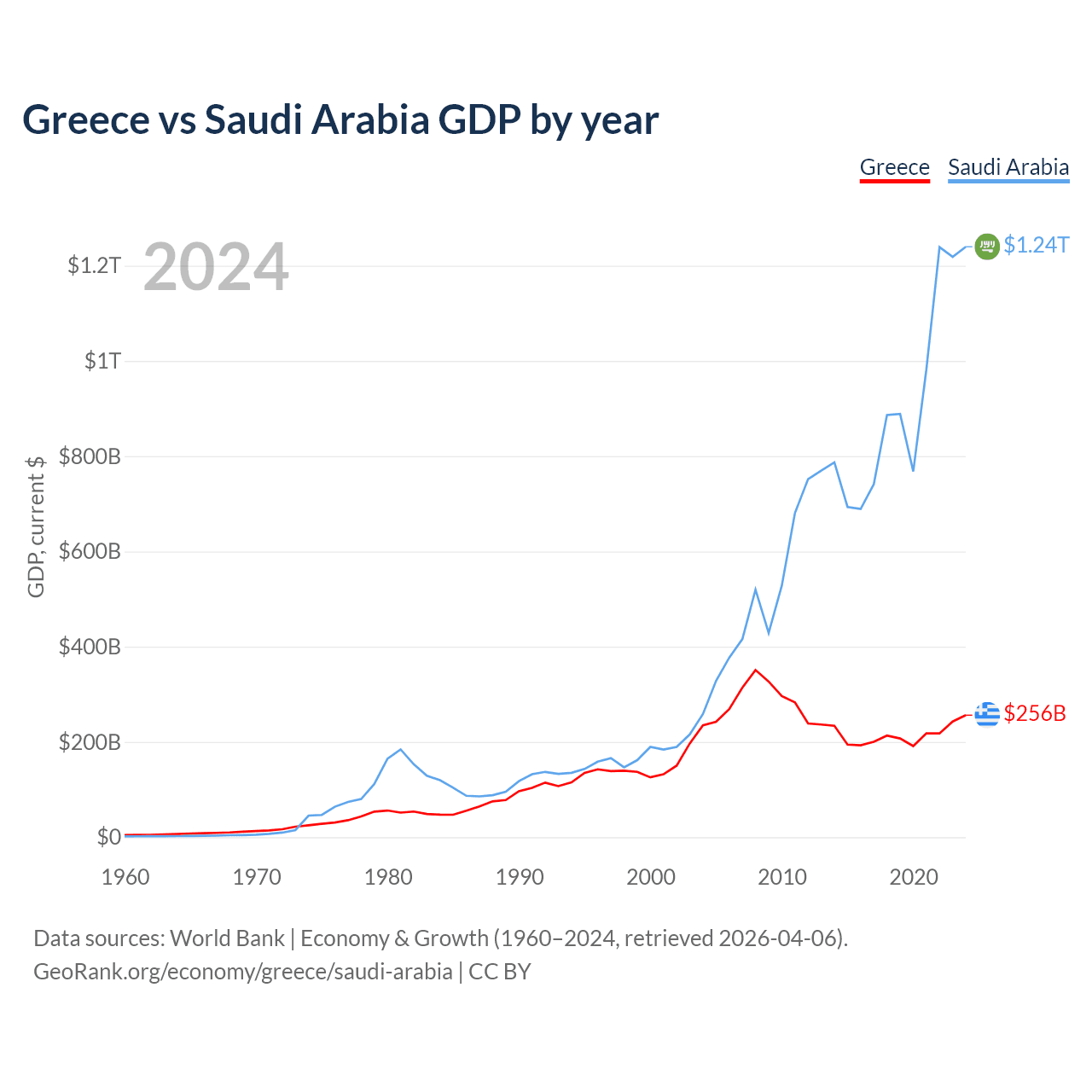 Greece has a GDP of $256B compared to $1.24T for Saudi Arabia, ranking 53/197 and 18/197 by economy size, respectively.