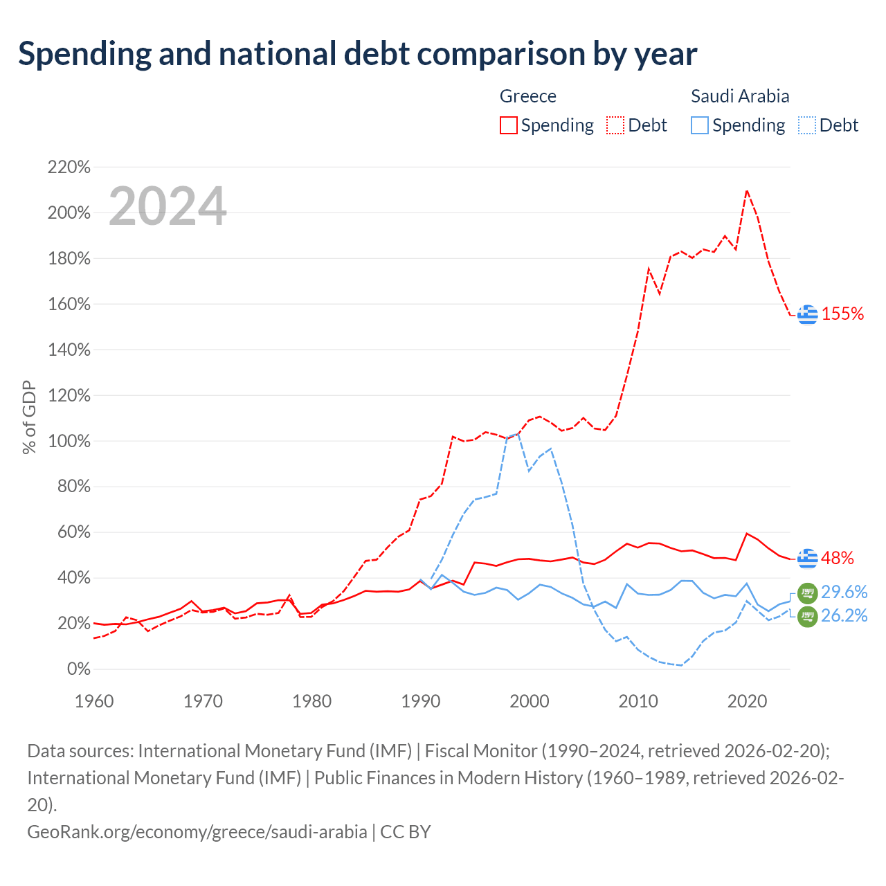 Greece has $397B in government debt (154.8% of GDP), compared to $324B (26.2% of GDP) in Saudi Arabia.