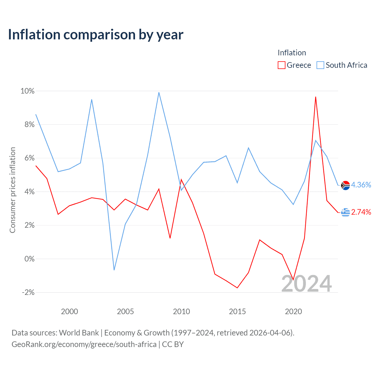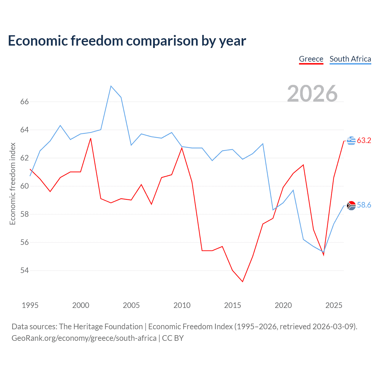 The Economic Freedom Index for Greece is 63.2, ranking 82/197, compared to 58.6 for South Africa, ranking 110/197. The chart above displays a comparison of annual changes in economic freedom indexes.
