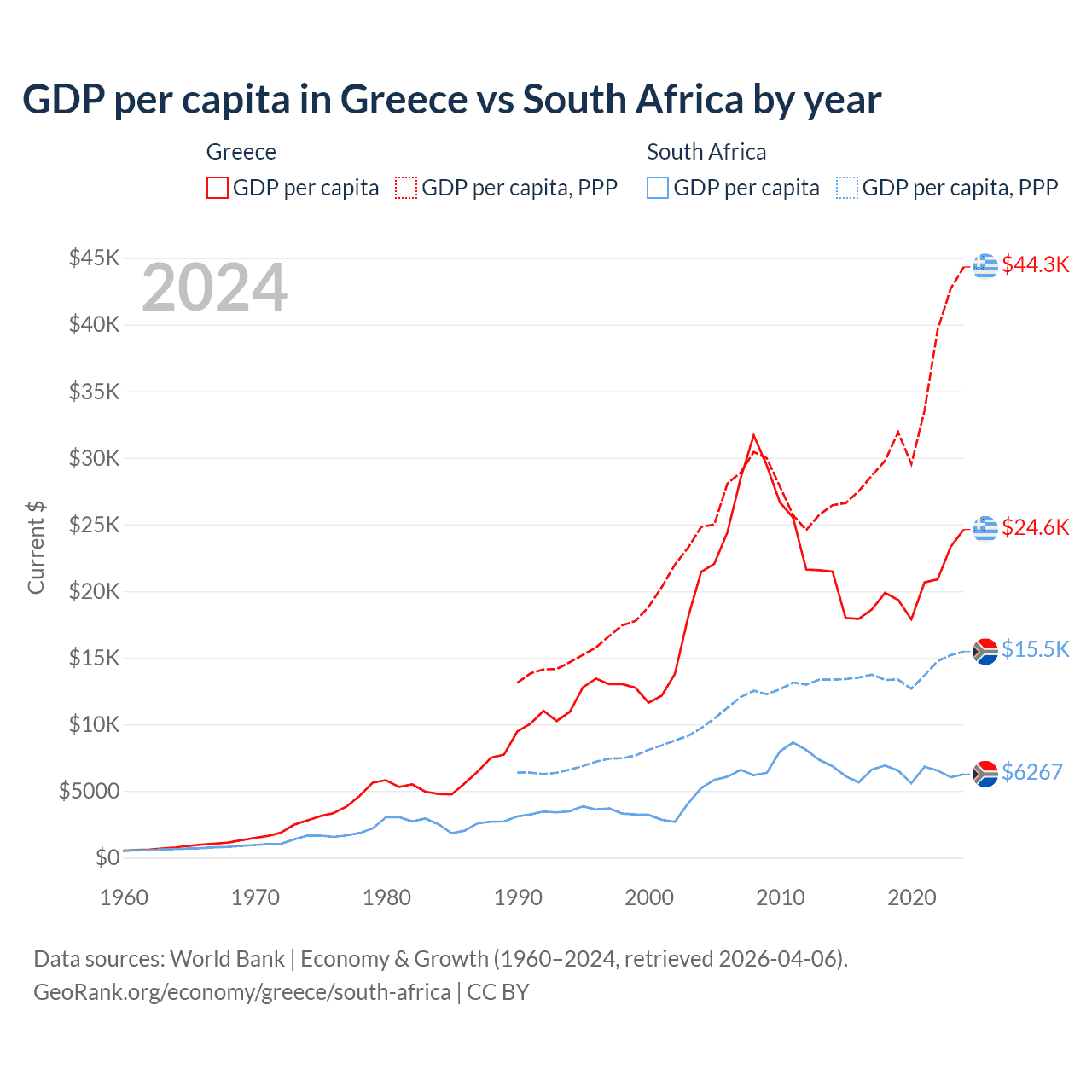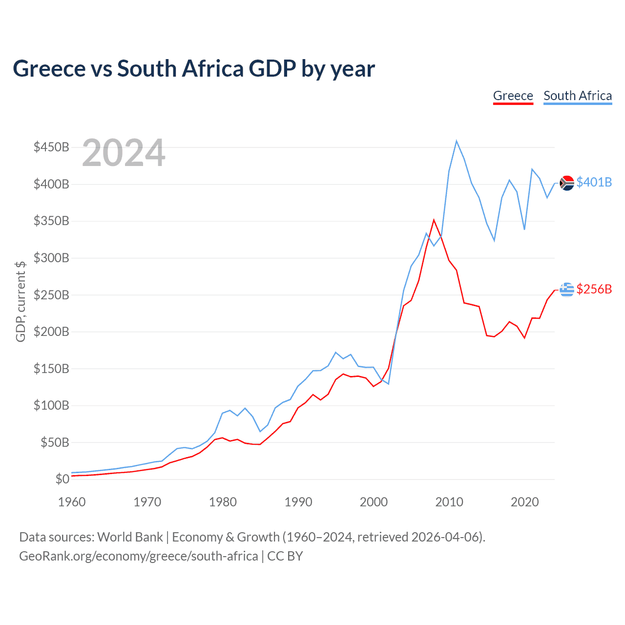 Greece has a GDP of $256B compared to $401B for South Africa, ranking 53/197 and 40/197 by economy size, respectively.