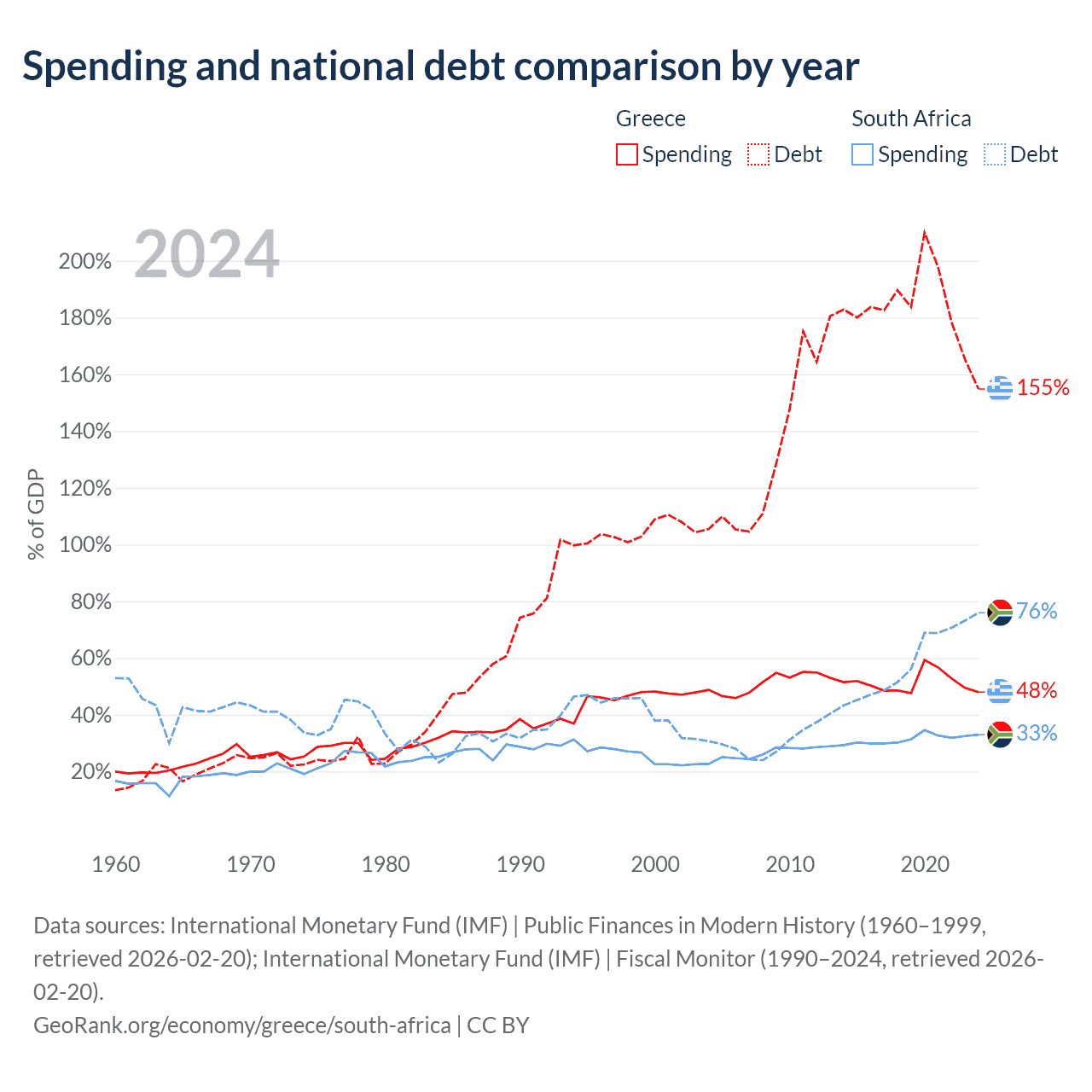 Greece has $397B in government debt (154.8% of GDP), compared to $305B (76% of GDP) in South Africa.