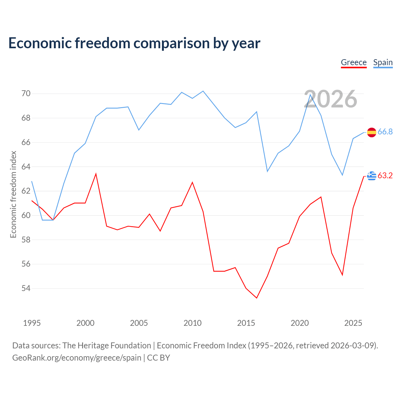 The Economic Freedom Index for Greece is 63.2, ranking 82/197, compared to 66.8 for Spain, ranking 59/197. The chart above displays a comparison of annual changes in economic freedom indexes.