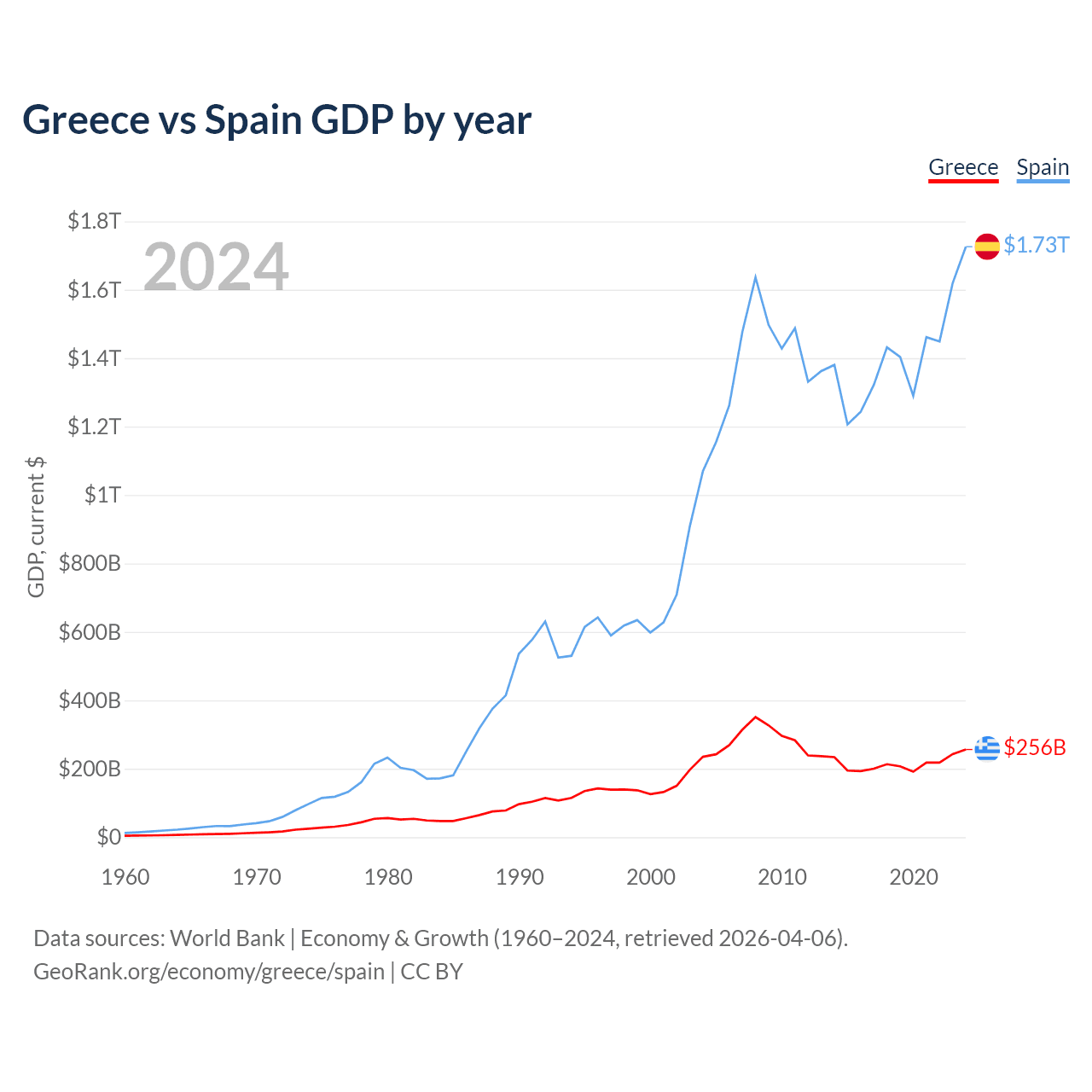 Greece vs Spain GDP by year