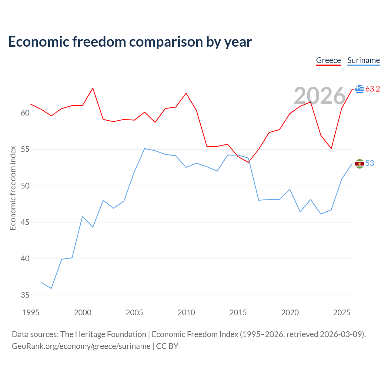 The Economic Freedom Index for Greece is 63.2, ranking 82/197, compared to 53 for Suriname, ranking 143/197. The chart above displays a comparison of annual changes in economic freedom indexes.