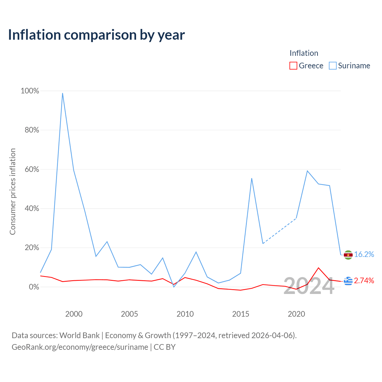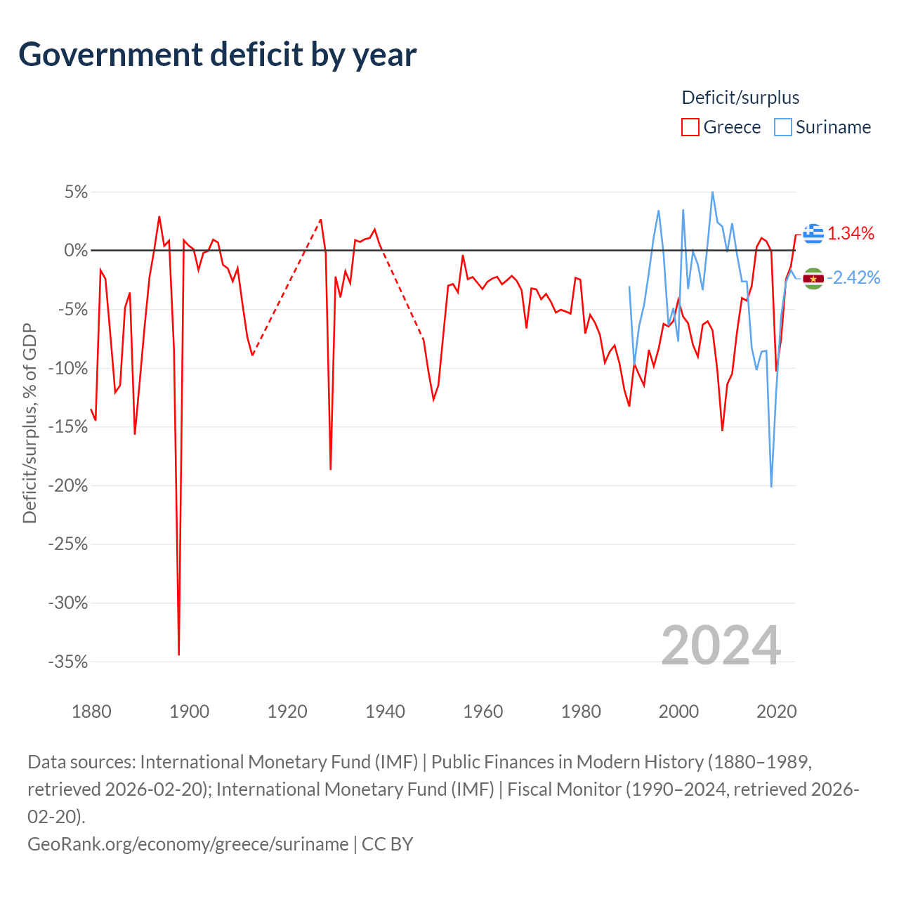 Greece has a GDP of $256B compared to $4.42B for Suriname, ranking 53/197 and 164/197 by economy size, respectively.
