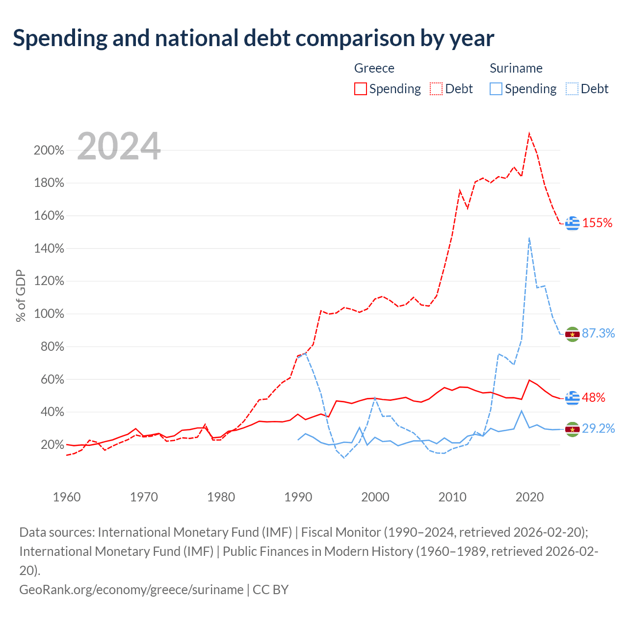 Greece has $397B in government debt (154.8% of GDP), compared to $3.86B (87.3% of GDP) in Suriname.