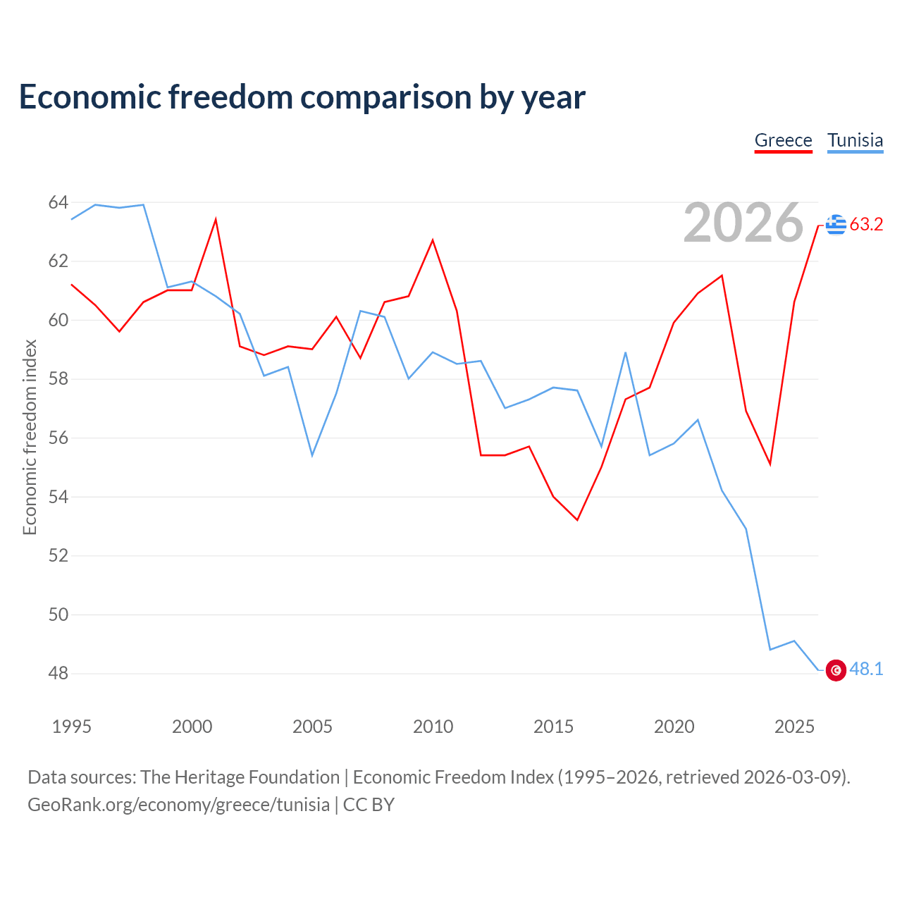 The Economic Freedom Index for Greece is 63.2, ranking 82/197, compared to 48.1 for Tunisia, ranking 172/197. The chart above displays a comparison of annual changes in economic freedom indexes.