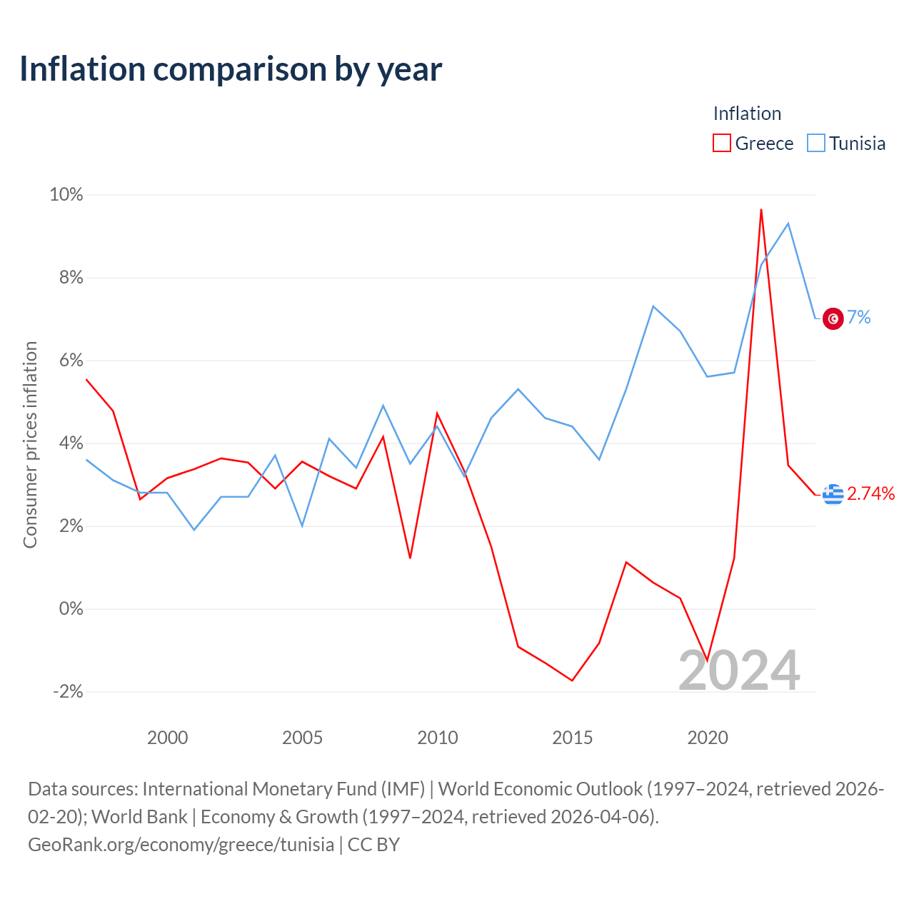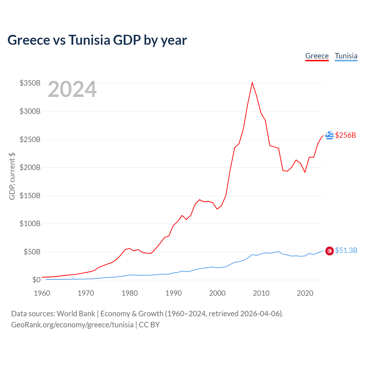 Greece has a GDP of $256B compared to $51.3B for Tunisia, ranking 53/197 and 93/197 by economy size, respectively.