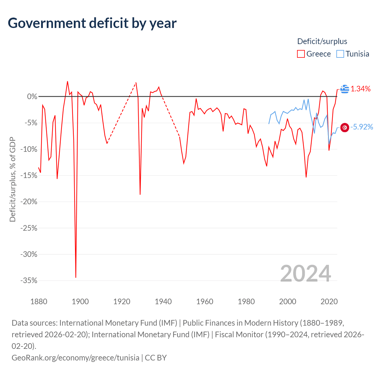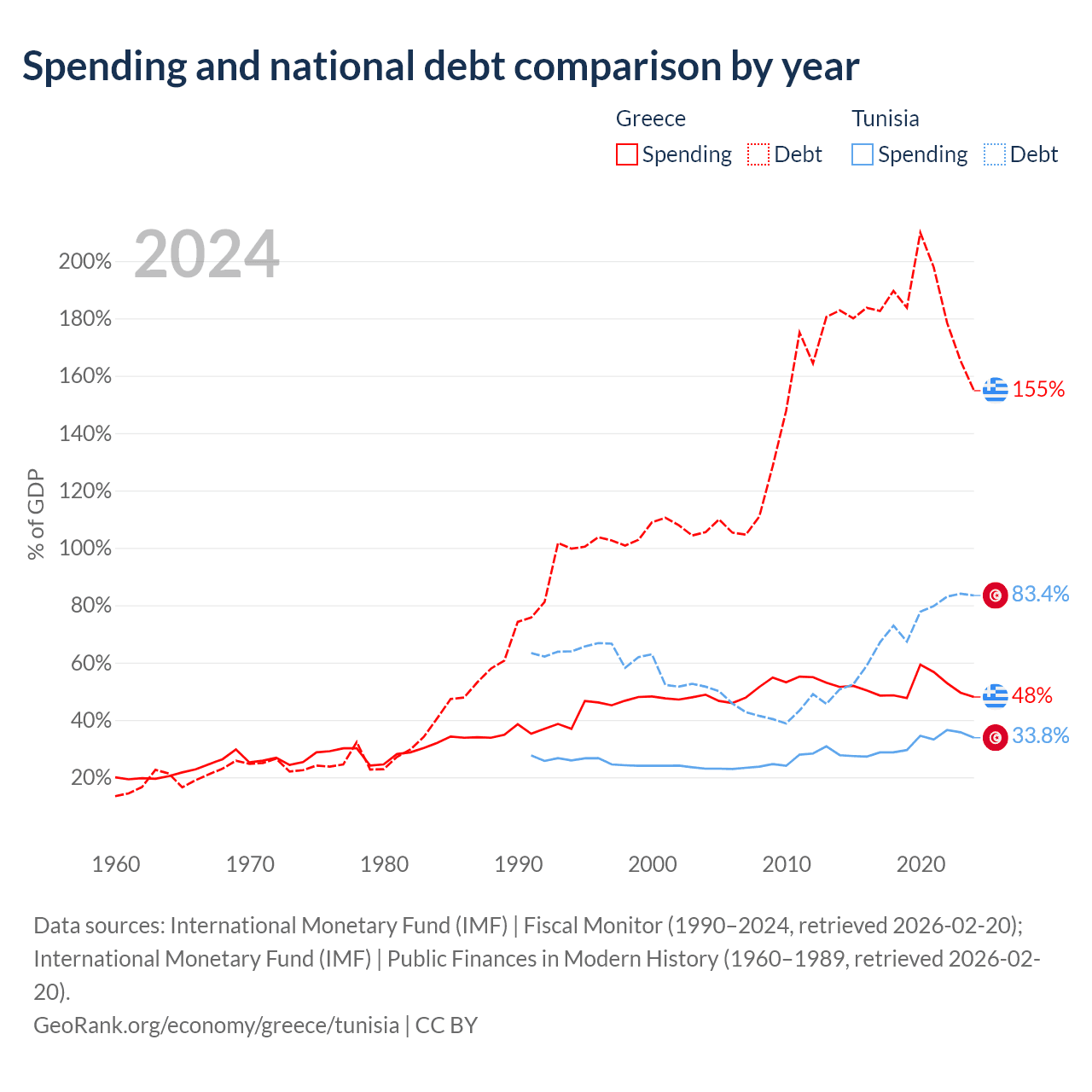 Greece has $397B in government debt (154.8% of GDP), compared to $42.8B (83.4% of GDP) in Tunisia.