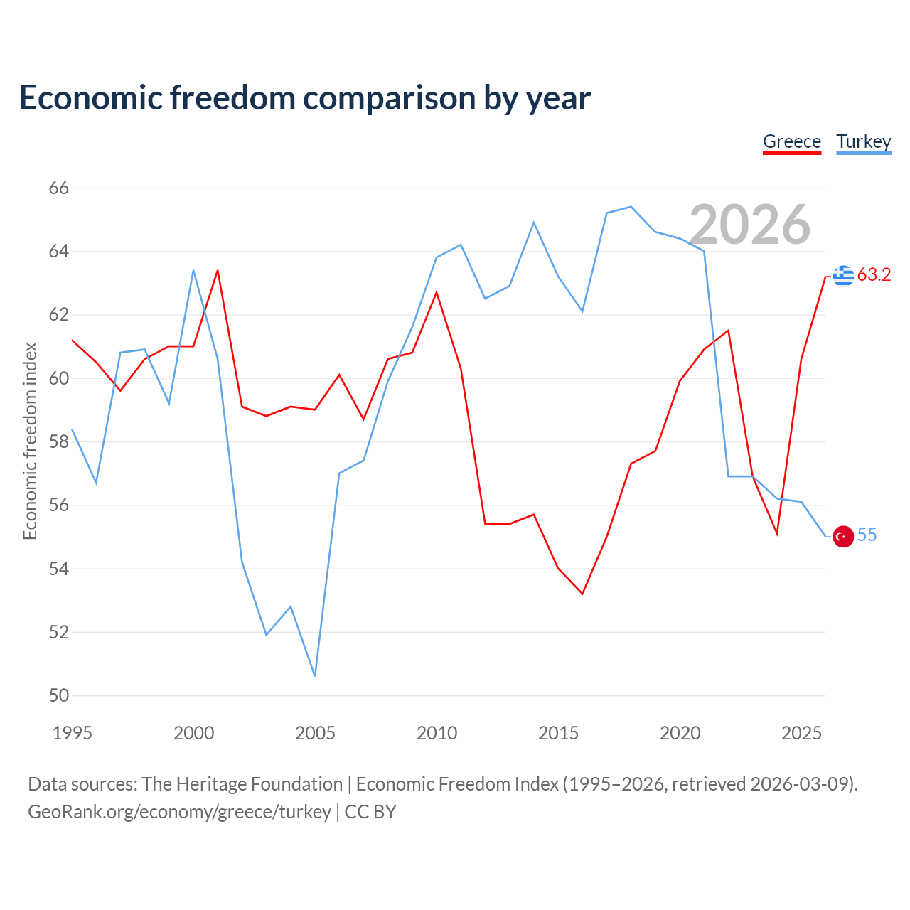 The Economic Freedom Index for Greece is 63.2, ranking 82/197, compared to 55 for Turkey, ranking 129/197. The chart above displays a comparison of annual changes in economic freedom indexes.