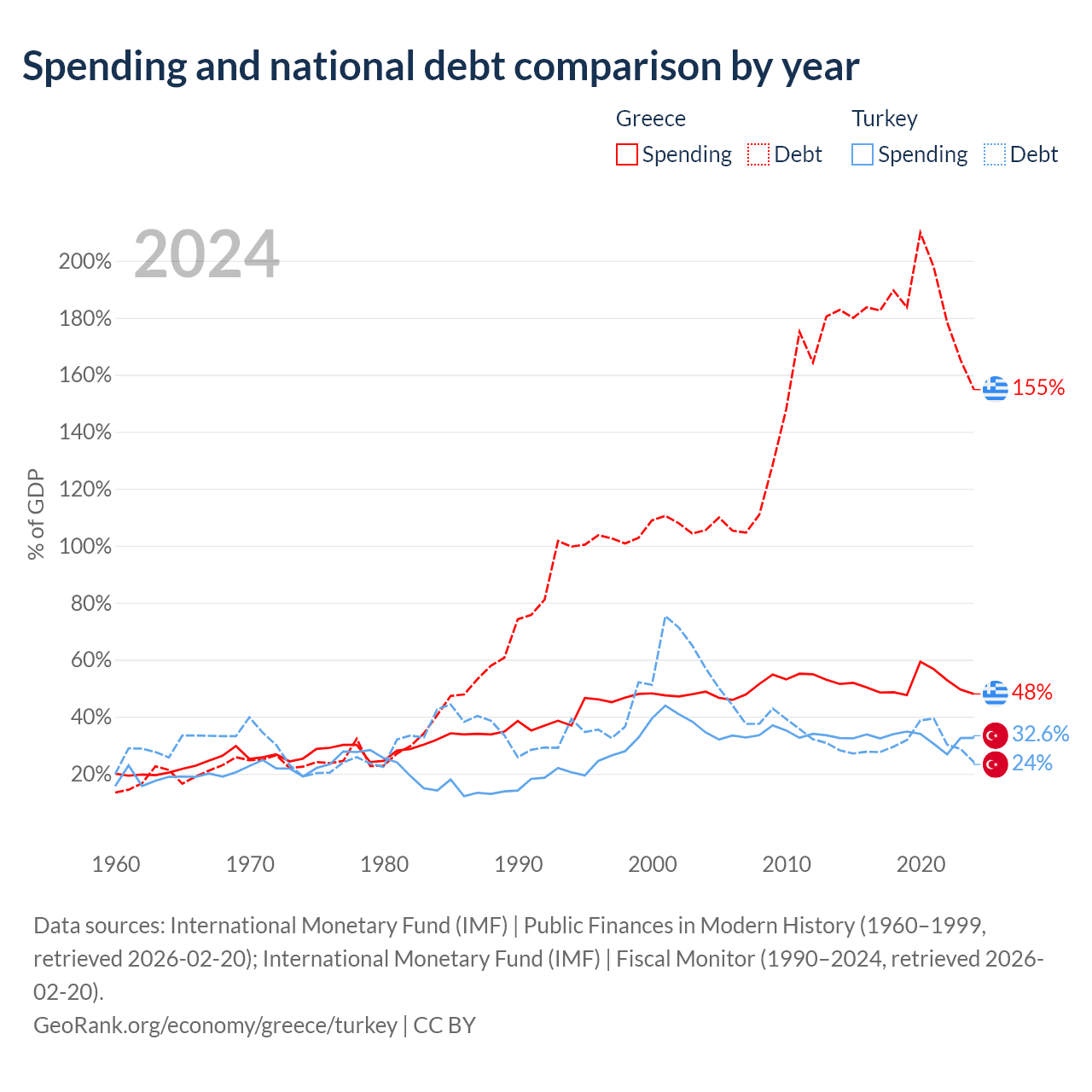 Greece has $397B in government debt (154.8% of GDP), compared to $327B (24% of GDP) in Turkey.