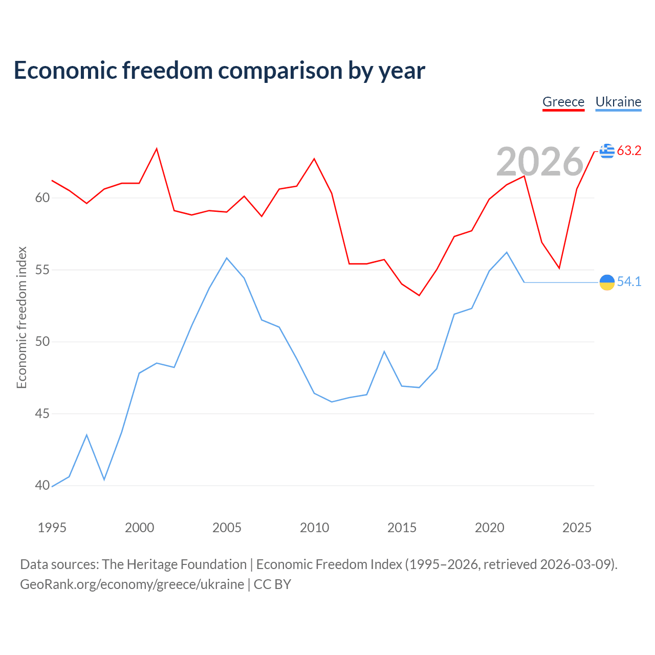 The Economic Freedom Index for Greece is 63.2, ranking 82/197, compared to 54.1 for Ukraine, ranking 135/197. The chart above displays a comparison of annual changes in economic freedom indexes.