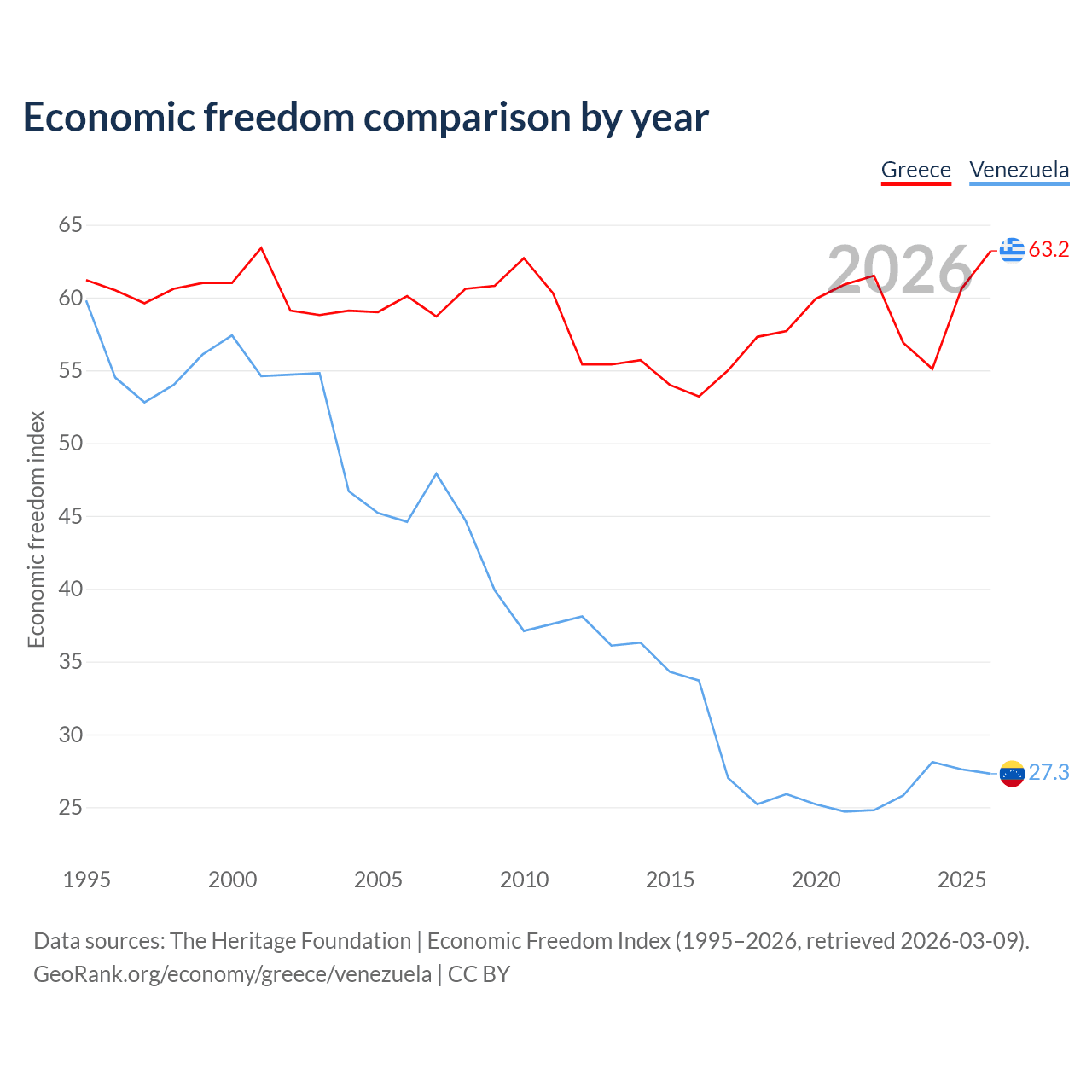 The Economic Freedom Index for Greece is 63.2, ranking 82/197, compared to 27.3 for Venezuela, ranking 194/197. The chart above displays a comparison of annual changes in economic freedom indexes.