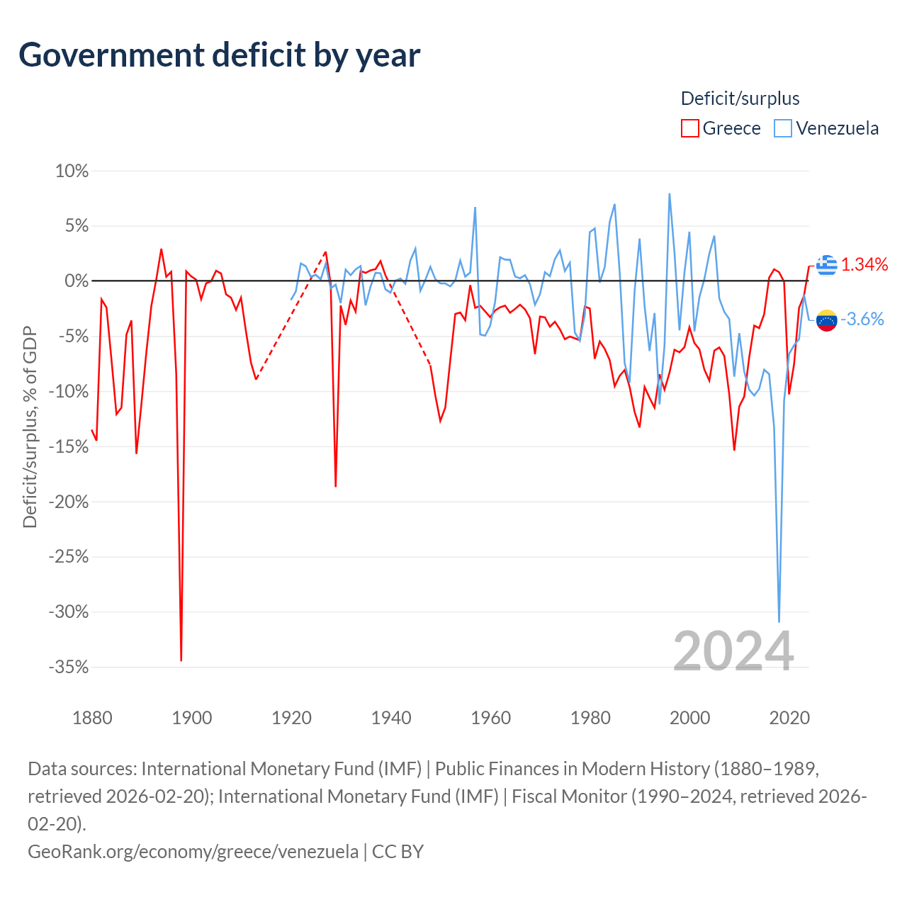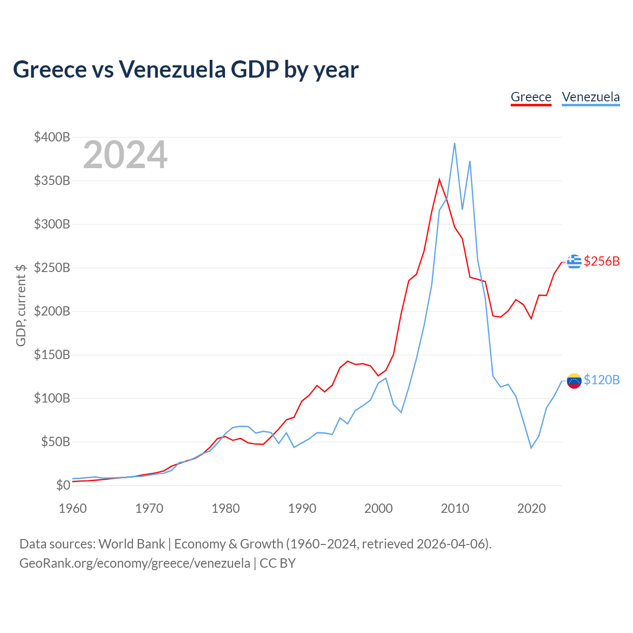 Greece has a GDP of $256B compared to $120B for Venezuela, ranking 53/197 and 65/197 by economy size, respectively.
