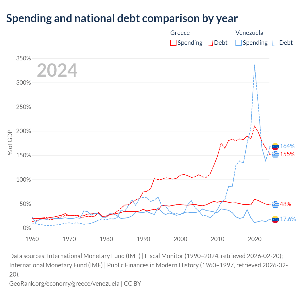 Greece has $397B in government debt (154.8% of GDP), compared to $197B (164.3% of GDP) in Venezuela.