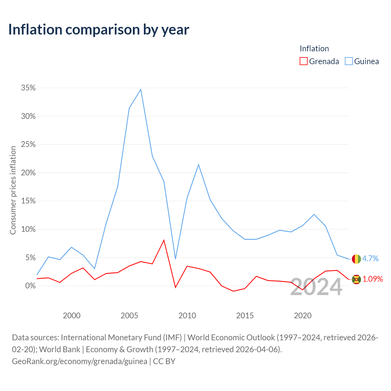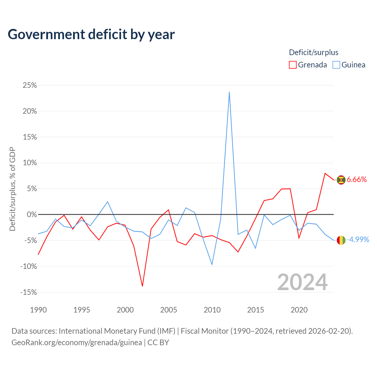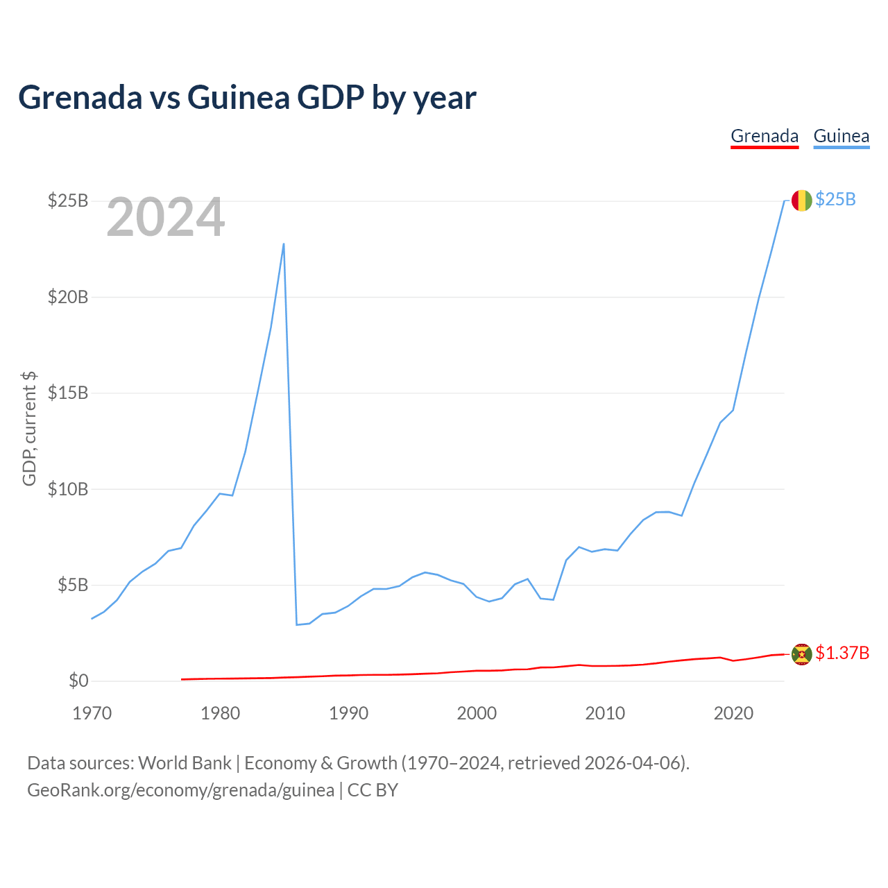 Grenada has a GDP of $1.37B compared to $25B for Guinea, ranking 184/197 and 118/197 by economy size, respectively.