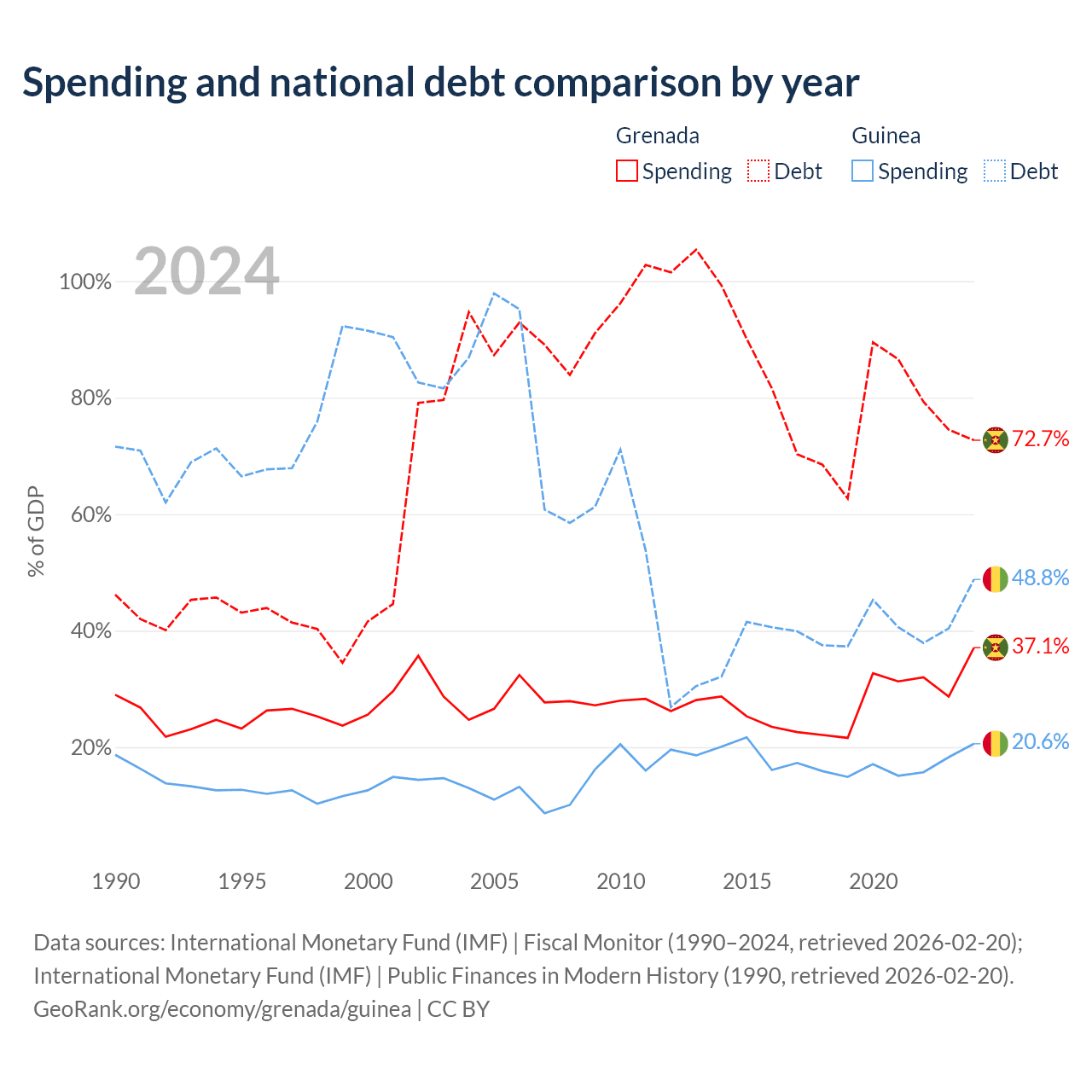 Grenada has $997M in government debt (72.7% of GDP), compared to $12.2B (48.8% of GDP) in Guinea.