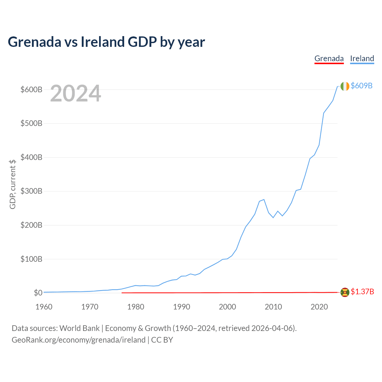 Grenada has a GDP of $1.37B compared to $609B for Ireland, ranking 184/197 and 25/197 by economy size, respectively.