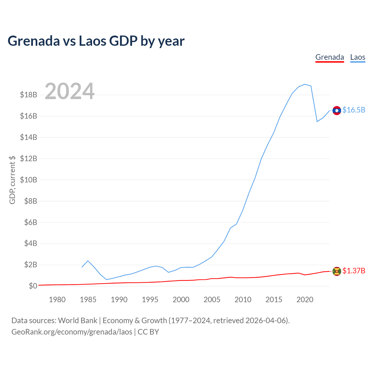 Grenada has a GDP of $1.37B compared to $16.5B for Laos, ranking 184/197 and 139/197 by economy size, respectively.