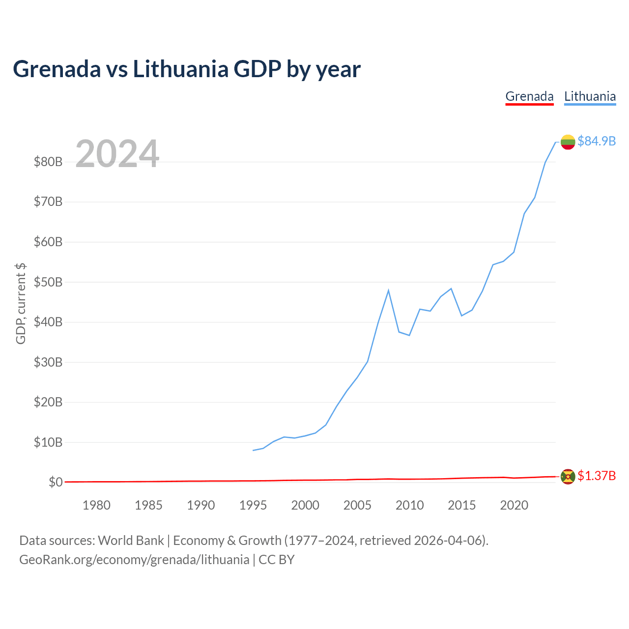 Grenada has a GDP of $1.37B compared to $84.9B for Lithuania, ranking 184/197 and 79/197 by economy size, respectively.
